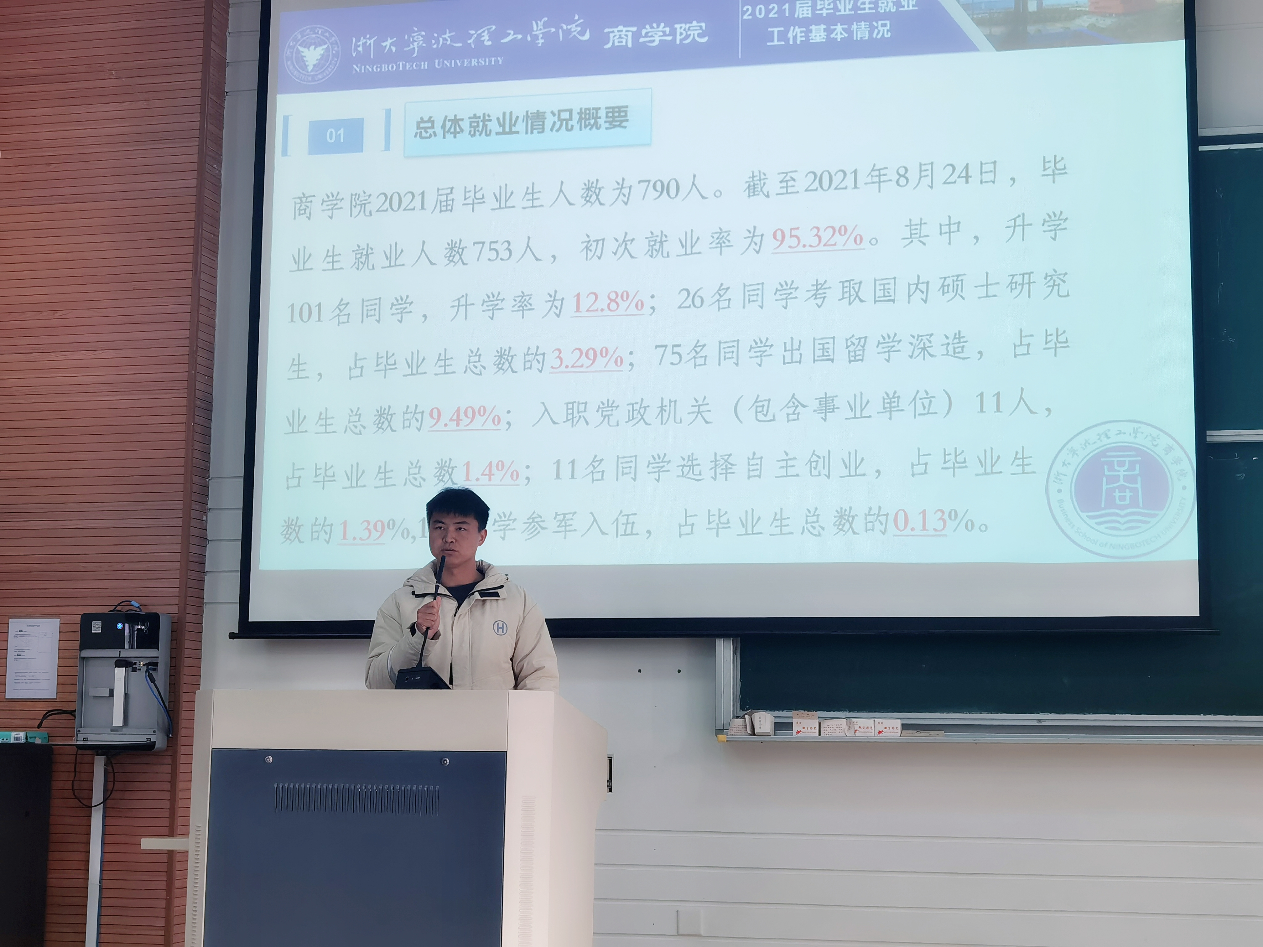 学院就业辅导员赵昌志老师在动员大会上简要通报了2021届毕业生就业基本情况,展示了就业三方协议网上操作流程,对就业信息获取途径、不同就业类别及毕业生档案转接等信息做了详细介绍。
