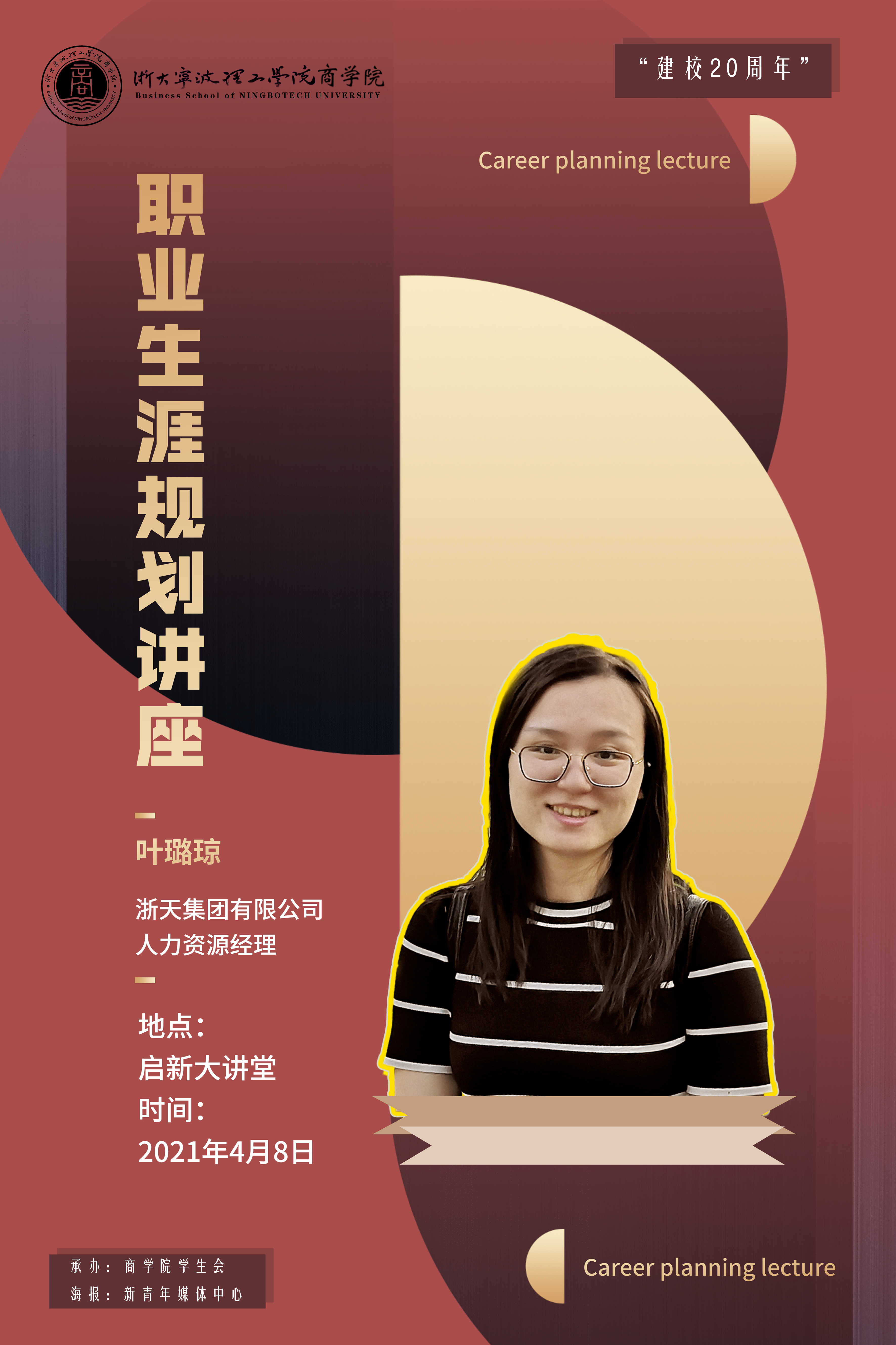 4月8日下午,商学院在启新大讲堂开展职业生涯规划讲座,浙天集团有限公司资深人力资源经理叶璐琼女士受邀讲座。商学院院长肖文,学院党委副书记、纪委书记周丽娟,学工办辅导员以及学院200余名学生参加讲座,周丽娟主持讲座。