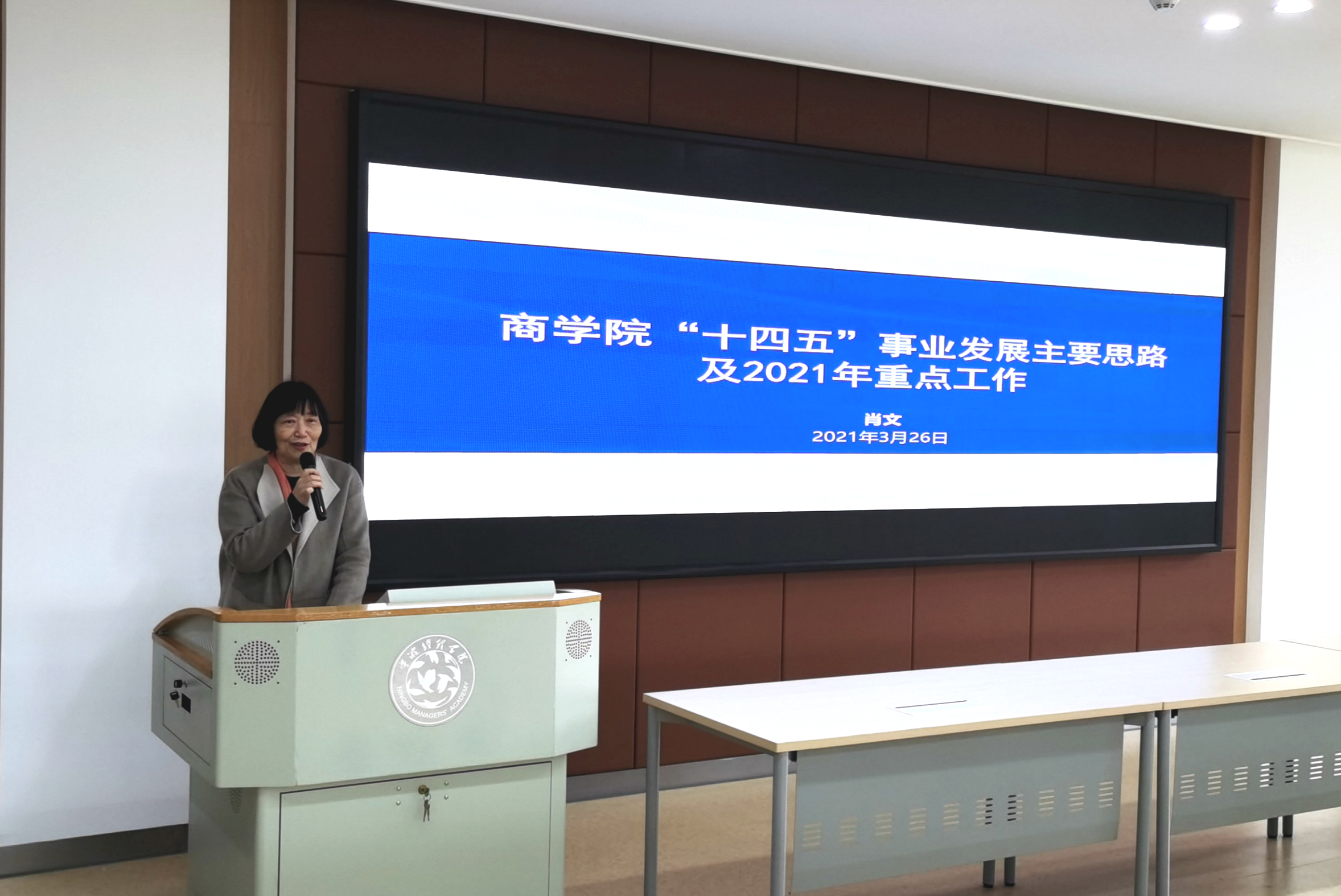 学院院长肖文介绍了学院“十三五”规划指标的完成情况并部署2021年重点工作。肖文重点解读了学院“十四五”规划制定的背景、主要特点、发展目标、重点举措和支撑保障,明确“十四五”期间学院将坚持特色发展、交叉融合发展、阶梯发展的原则,以“数字经济与管理”为方向凝练特色,深入参与学校“智慧化港口与服务”交叉学科群建设,重塑学科科研优势、优化本科生培养体系。