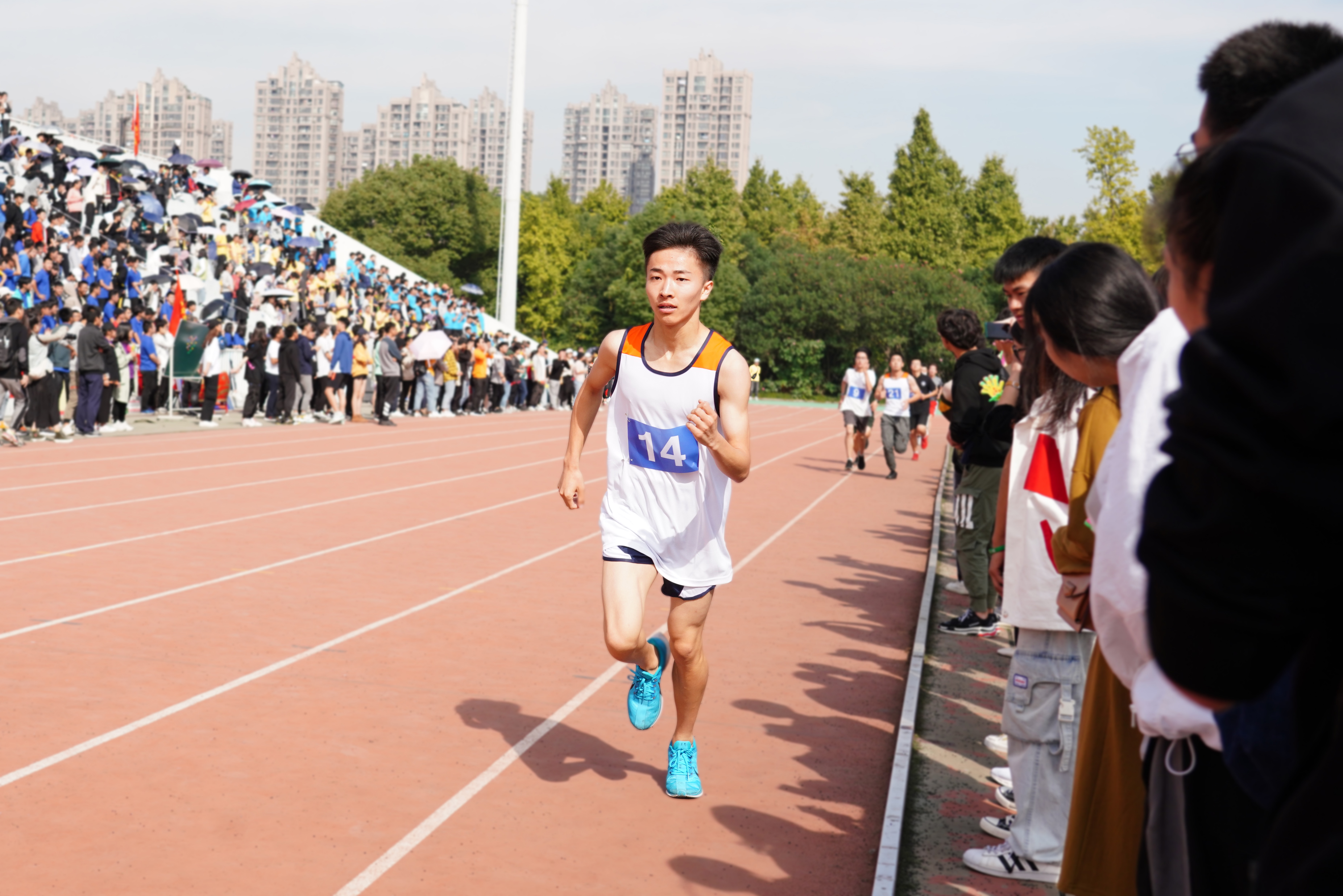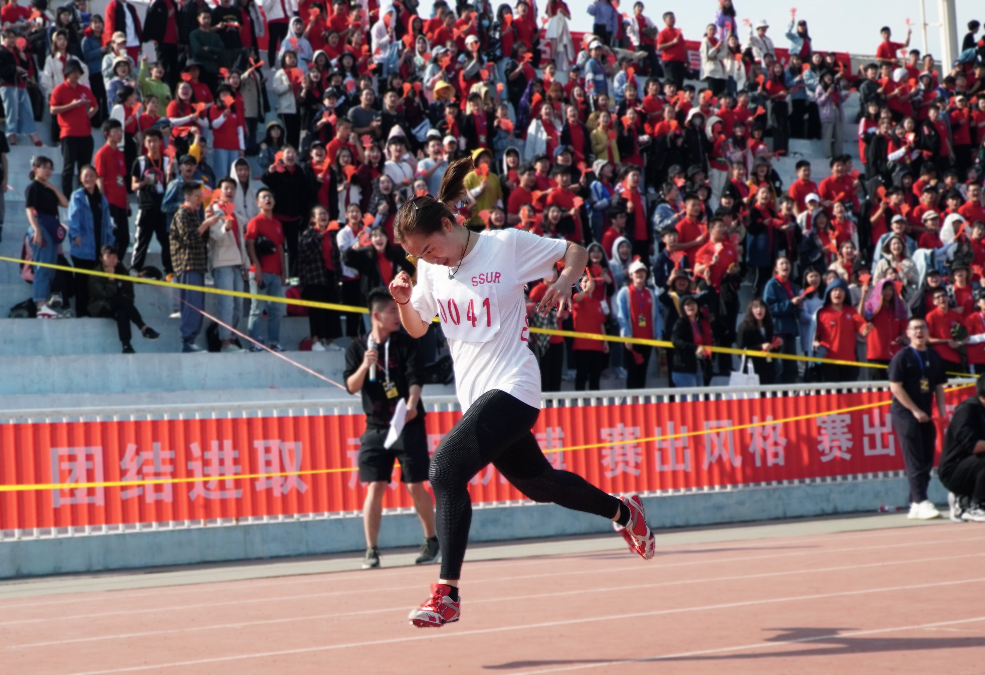 红色竞技场,青春无极限。在比赛中,商学院的运动健儿们同心协力,敢于拼搏,永不放弃,不断超越自我。看台上的师生们亦是气势如虹,不断挥舞着加油棒,敲打着商院大鼓,呐喊着商院口号为运动健儿们加油鼓劲,一排排律动构成了一道亮丽的红色风景线,为这个秋天这个赛场涂上了最鲜艳的商院红。