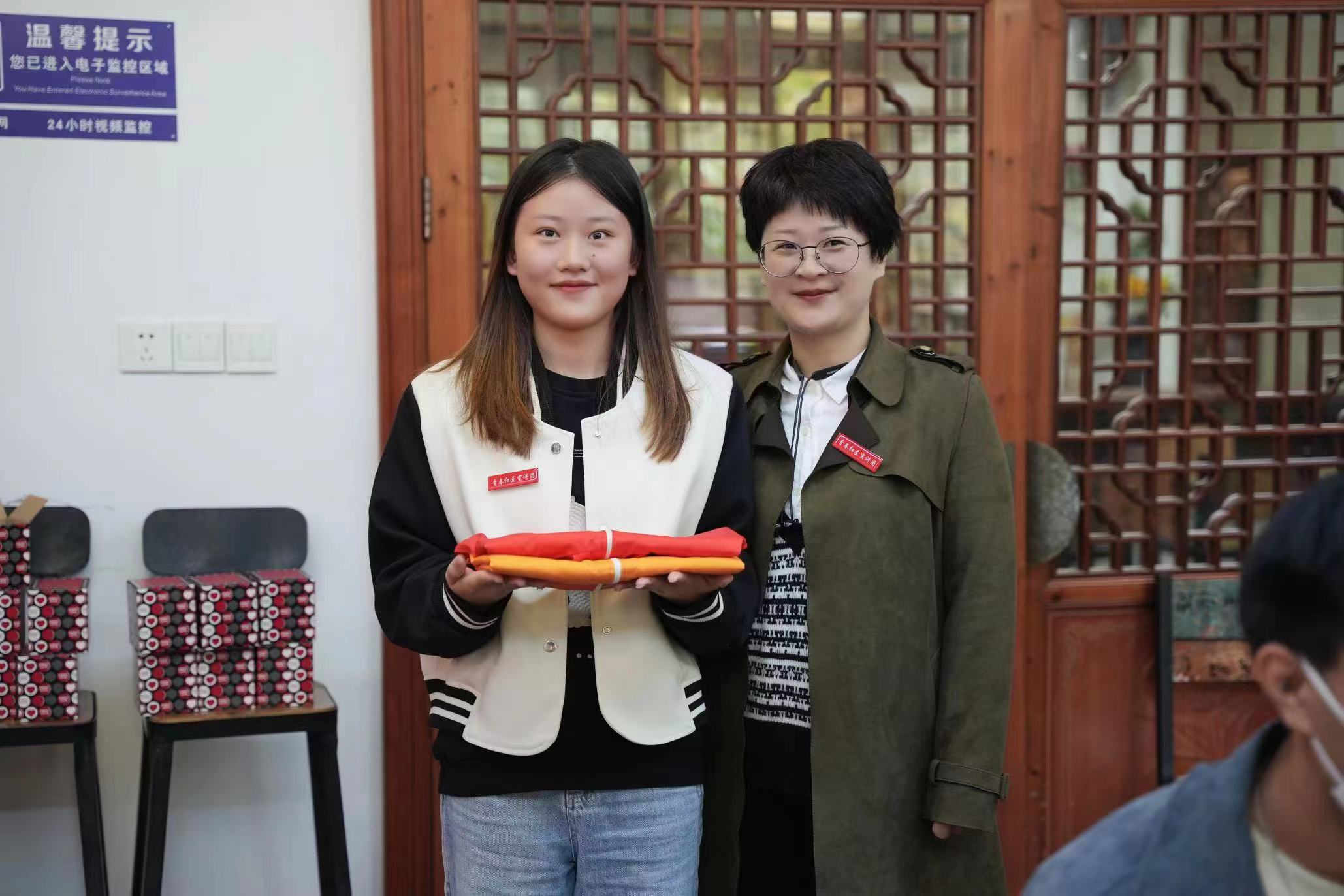 指导老师张维雅给各部门主要负责人颁发聘任证书、授队服和分发工作牌。