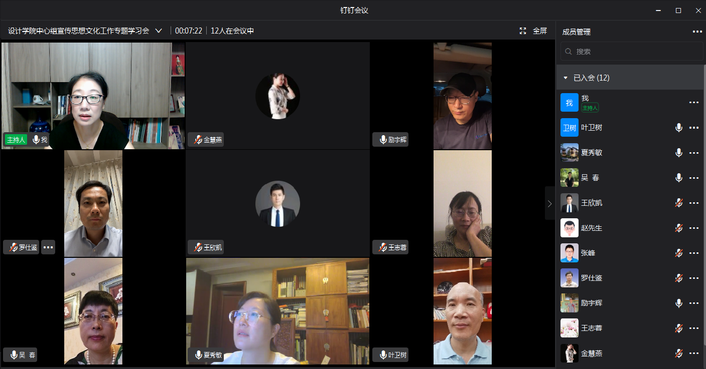为深入学习领会中央关于宣传思想文化工作的重要指示精神,提高学院相关工作质量和效果,8月24日晚,设计学院通过线上视频会议的形式举行了党委理论学习中心组专题学习会,学习研究宣传思想文化工作。会议由学院党委书记吴春主持,学院党委理论学习中心组全体成员参加。