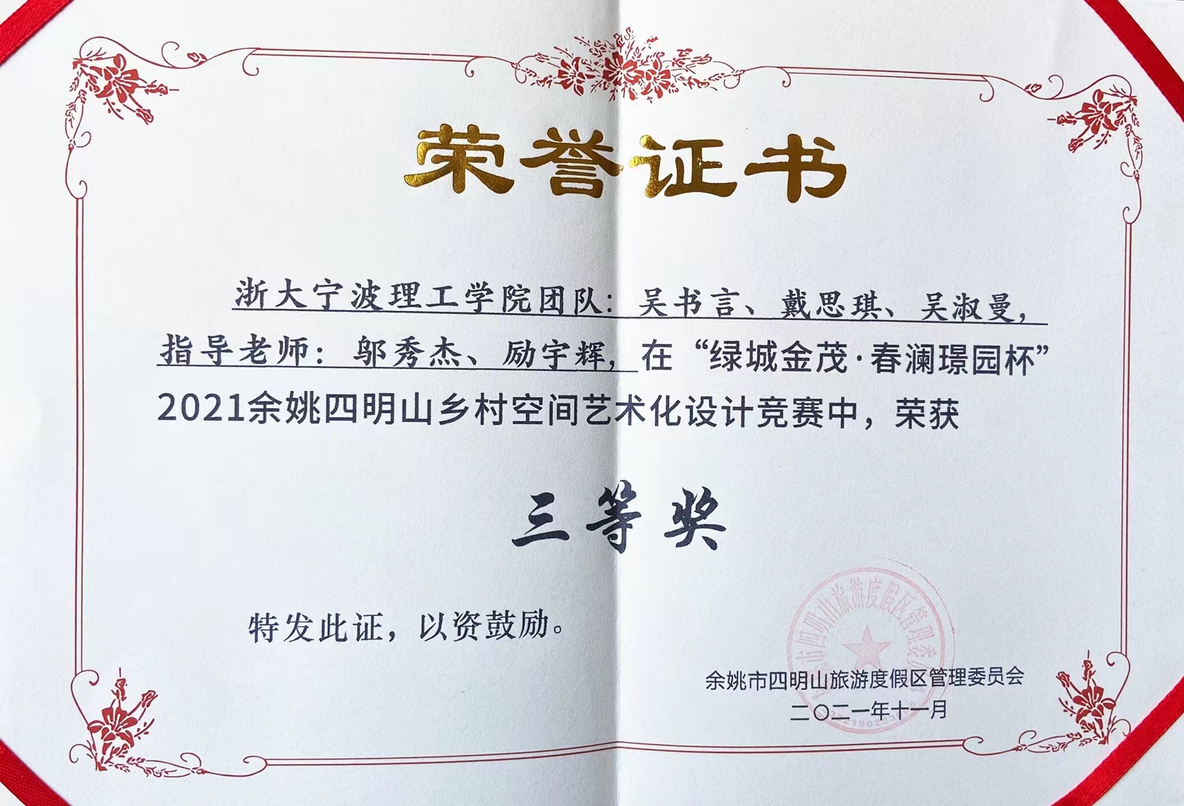 由余姚市四明山旅游度假区管理委员会主办、余姚浙协置业有限公司承办的“绿城金茂·春澜璟园杯”2021余姚四明山乡村空间艺术化设计竞赛结果于日前揭晓。此次参赛队伍多为设计单位团队,经过激烈角逐,开云学生团队脱颖而出,环境设计191班的吴书言、戴思琪、吴淑曼三位同学组成的团队在邬秀杰、励宇辉两位老师的悉心指导下,设计作品《竹曲溪语》喜获三等奖。