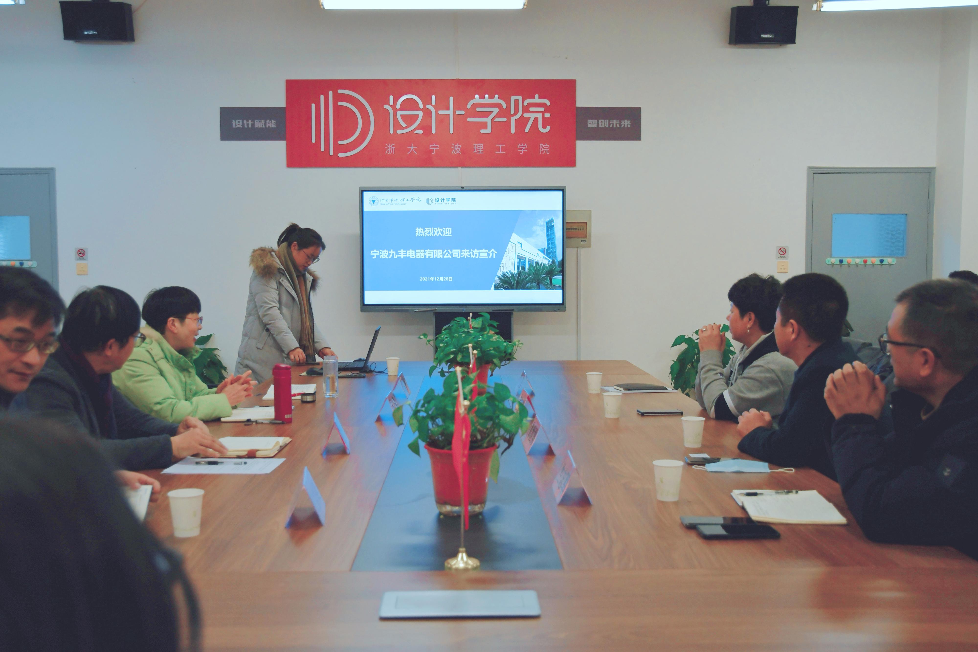 12月28日下午,宁波九丰电器有限公司总经理章世勇、副总经理楼鑫钱、竺志军一行到访设计学院,开展宣介活动,并就双方合作展开深入洽谈。学院党委书记吴春,党委副书记叶卫树,副院长赵建国,院长助理张峰出席,相关专业教师及高年级学生近40人参加活动。