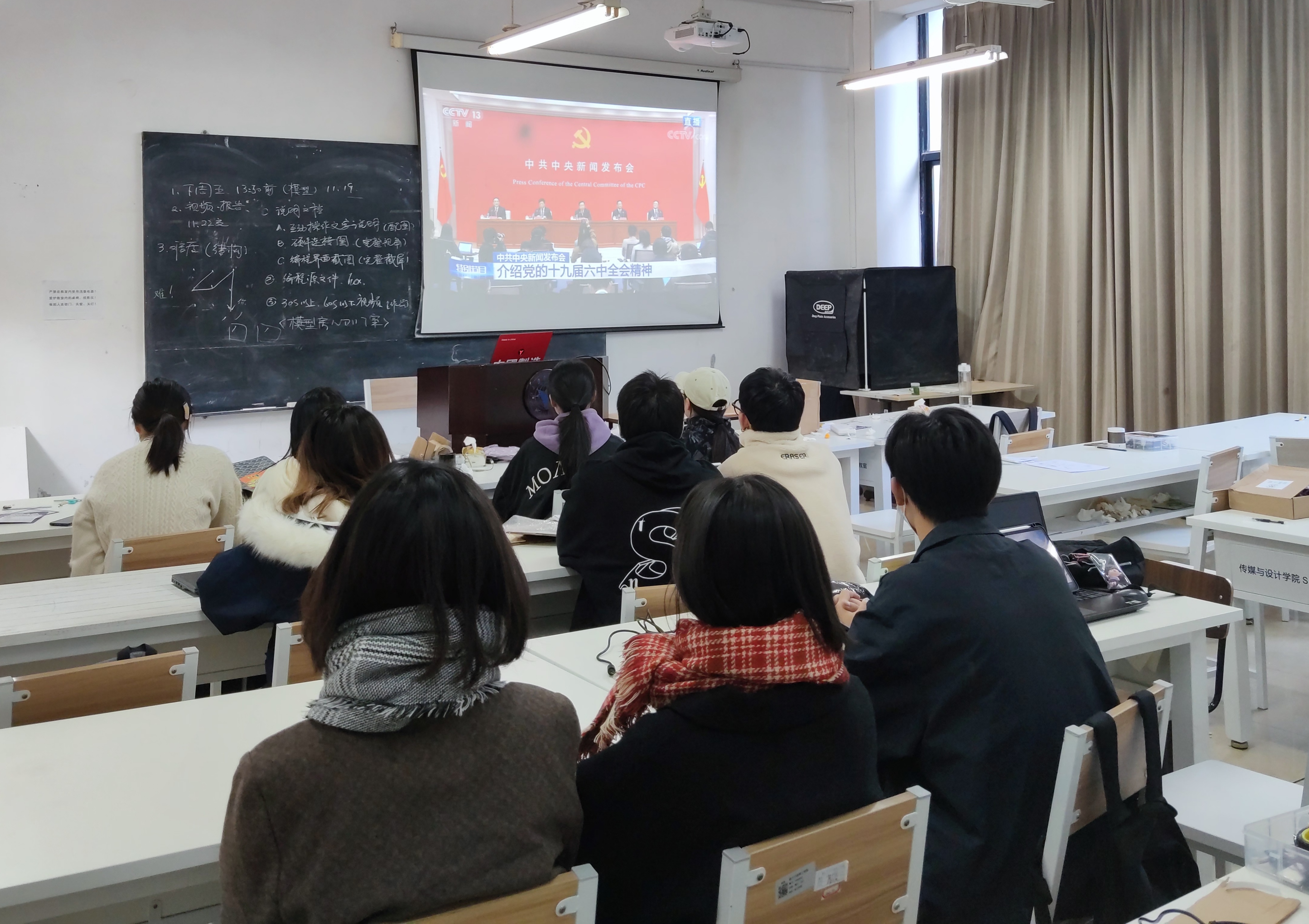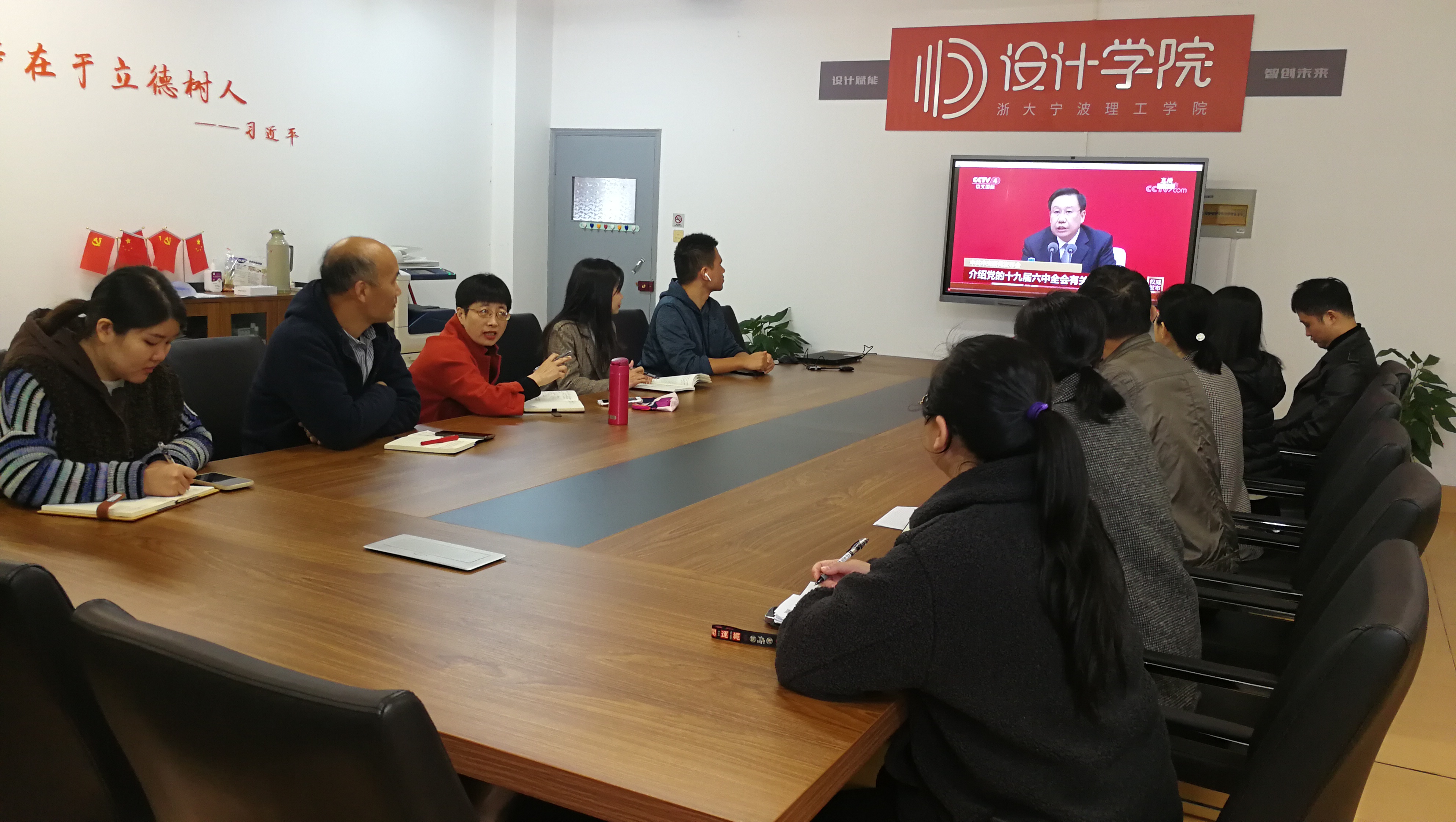 中国共产党第十九届中央委员会第六次全体会议,于2021年11月8日至11日在北京举行,习近平总书记发表重要讲话。11月12日上午10时,中共中央举行新闻发布会,介绍党的十九届六中全会精神。设计学院师生在教室、会议室、寝室等地观看了发布会直播,聆听中央有关部门领导、专家权威解读十九届六中全会精神。