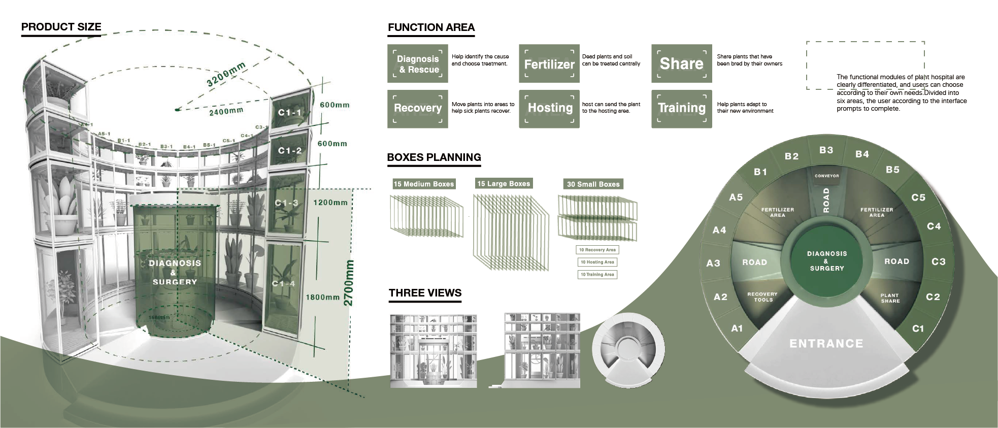 获奖作品“Plant Hospital”植物医院是一种帮助城市居民抢救和治疗家庭植物的公共互动产品。灵感来自人们对于植物习性缺乏了解,缺乏处理植物生病状况的需求而设计。整个设计分为五个区域:诊断辅助区、住院区、代用品管理区、土壤回收和发酵区、共享区。用户可以通过手机根据自己的需要选择植物医院的服务,然后将植物送到植物医院进行操作。对于病情严重的植物,用户可以选择让植物住院,植物医院的病房可以给它们提供最舒适的环境。