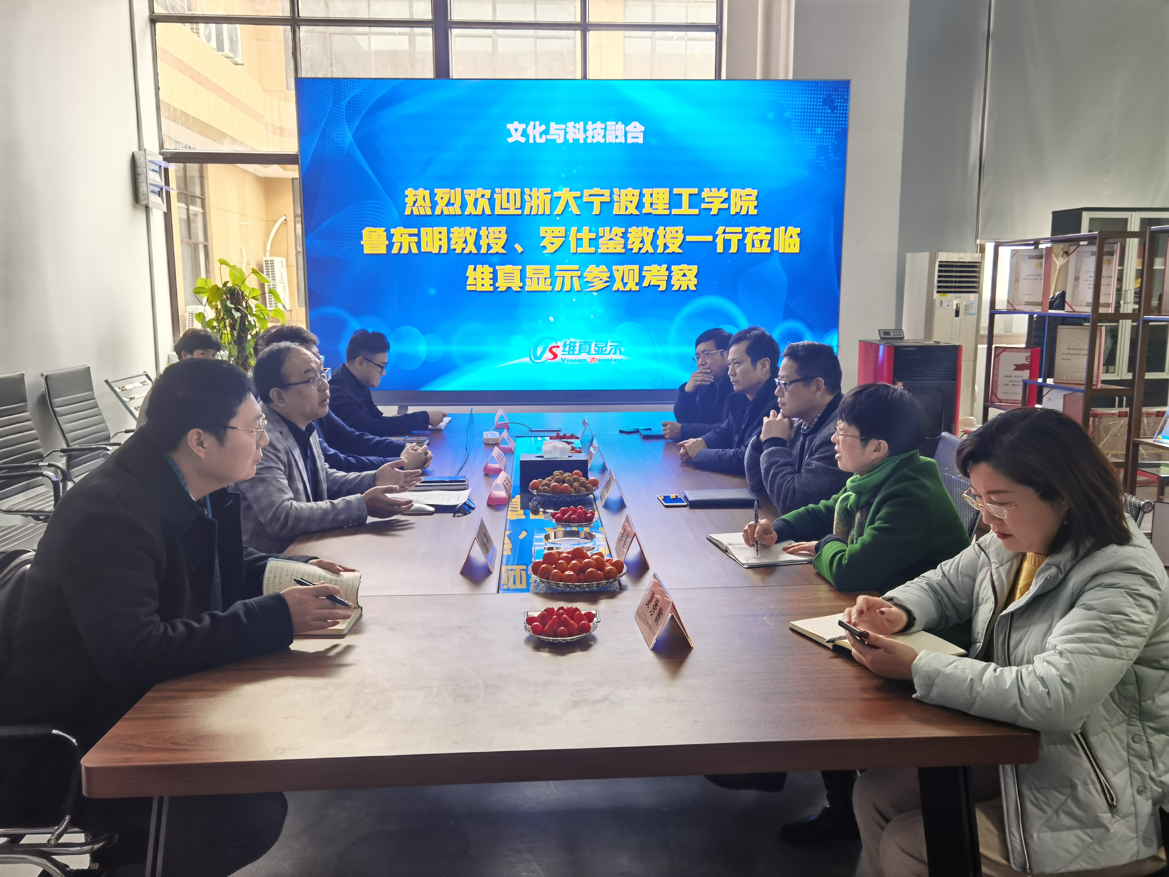 1月21日中午,学校副校长鲁东明、设计学院院长罗仕鉴、党委书记吴春、副院长赵建国、院长助理张峰、夏秀敏等一行赴国家高新技术企业、宁波市3315高层次人才计划引进企业——宁波维真显示科技股份有限公司考察调研。