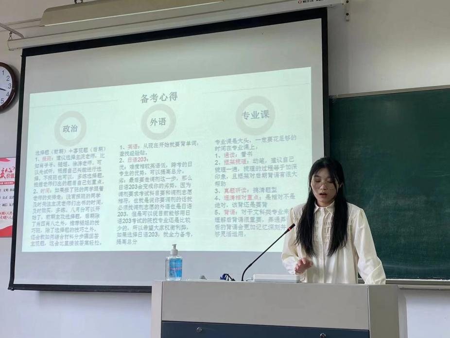 来自日语181班的范综莹同学向19级日语系学生现场分享了自己的考研心得,她以437分的高分被吉林大学外交学专业录取为硕士研究生。范同学认为,除了努力,选择也十分重要。她从地区、院校、专业到报录比、压分情况等方面,由浅入深,进行了详细的分析,认为选择适合自己的院校和专业能增加考研一次成功的概率。作为跨专业的考生,范综莹也就如何准备各个科目的考试给出了有益的建议。另外,她还分享了自己在合理安排学习时间,调高学习效率,适当给予自己心理暗示等方面的心得体会。范综莹寄语学弟学妹:历经艰辛也要坚持到底,最终才能取得最好的结果。