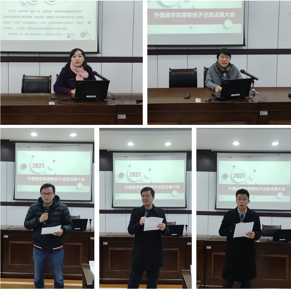 会上,学院院长胡洁代表领导班子作了2021年外国语学院领导班子述责述廉工作报告。她从班子建设、特色工作、重点工作、问题与整改四个方面,回顾了过去一年学院领导班子在完善体制机制改革、落实党风廉政建设、提高学院教学与科研水平、加强师资队伍建设、推进教育国际化、强化特色平台建设等方面所取得的成绩,分析了学院在师资队伍建设、教学科研能力提升等方面存在的不足,并提出了今后努力改进的方向与办法。随后胡洁院长、傅晓宇副书记、蔡亮副院长、周汶副院长和任凯副书记分别就个人情况进行了述责述廉汇报。