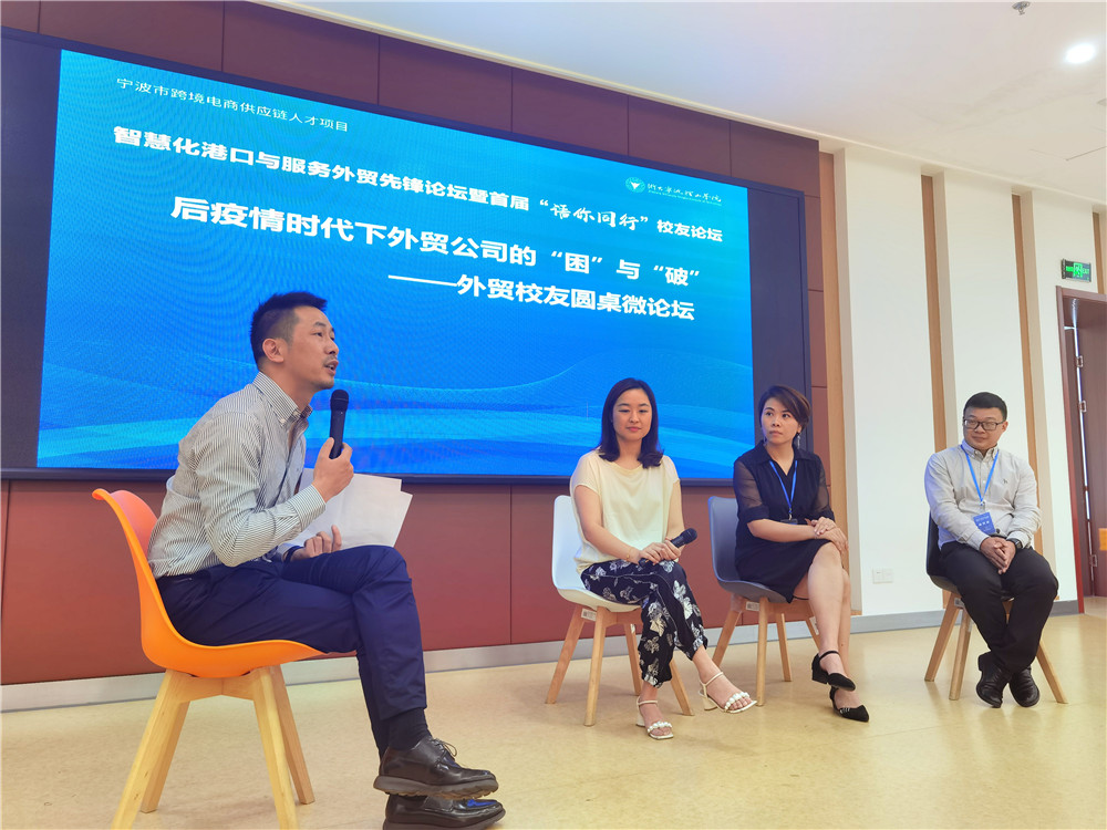 为期一天的论坛上,从事外贸服务的7名校友围绕“传统外贸企业如何转型升级”、“后疫情时代下的货运企业如何另辟蹊径谋求发展”、“如何规避外贸业务中的法律风险”以及“货运行业的行情分析及订船技巧”、“宁波跨境电商发展情况及产业分析”等大家关注的热点问题进行了主旨发言,通过分享自己公司转型的案例,总结开拓跨境电商的经验,分析货运行情和外贸业务中的法律风险,为校友企业如何结合宁波“225”外贸双万亿行动,利用“互联网+宁波制造+跨境贸易”优势,加快转型升级提供了思路和借鉴。在互动交流阶段,与会人员围绕后疫情时代下外贸公司的“困难”与“破局”、如何深度开发欧美发达国家细分市场、如何大力拓展“一带一路”沿线新兴市场进行了探讨。