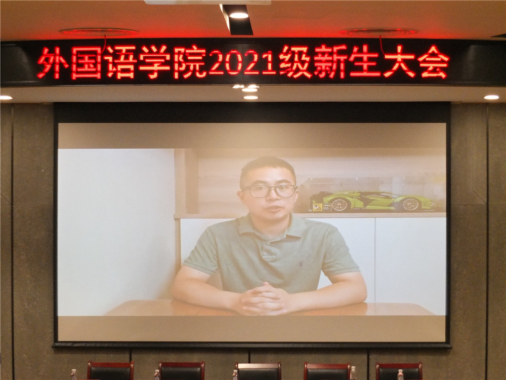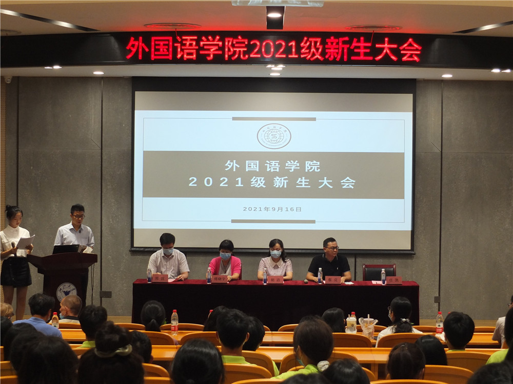 2021年9月16日晚,外国语学院2021级新生大会在启新大讲堂顺利召开,外国语学院院长胡洁,党委副书记(主持工作)傅晓宇,副院长蔡亮、副院长周汶、党委副书记任凯、日语专业学科带头人李先瑞教授、外国语言研究所副所长欧琛、所长助理林晶晶,所长助理丁旭、英语专业负责人李军、日语专业负责人邓凌志、外籍教师玛格达、阿图尔博士、21级新生班导师、学院行政教师及全体21级新生共同出席,本次大会由我院党委副书记任凯与我院20级英语专业学生姚可欣双语主持。