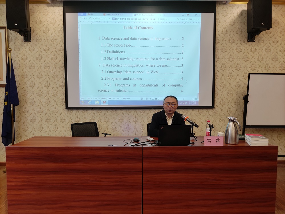 讲座中,雷教授首先从对数据科学的角度来说明语言学研究中数据和计算方法的重要性,并比较了数据科学视域下的语言学与计算语言学和语料库语言学之间的差异。他介绍了当前高校新增的相关专业和课程设置情况,强调数据科学视域的研究从本质上看提出的语言学问题,用数据挖掘的方法加以解决,因此语言学知识的积累和问题意识至关重要。雷教授还结合自己在文献计量学、学术英语、二语写作和情感分析领域的研究,向大家介绍了如何利用R语言和Python中的情感分析、主题建模和词向量等工具包进行数据挖掘等内容。