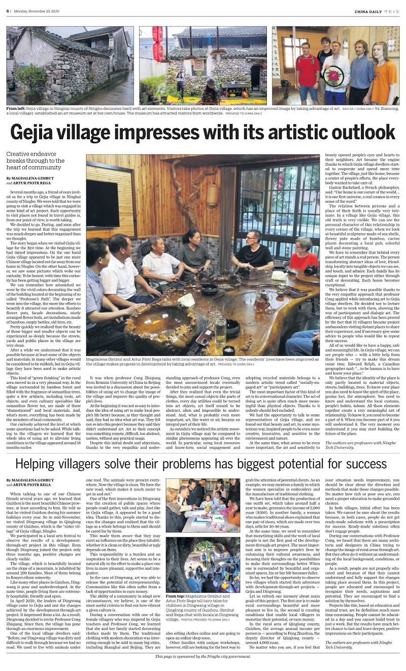 波兰研究中心外教玛格达莱娜博士和雷加博士撰写的文章《葛家村的艺术风貌令人叹为观止》和《帮助村民解决问题,最大保障实现脱贫》于11月23日刊登在《中国日报》(英文版)。