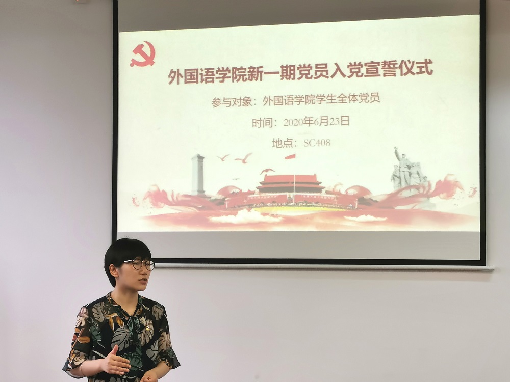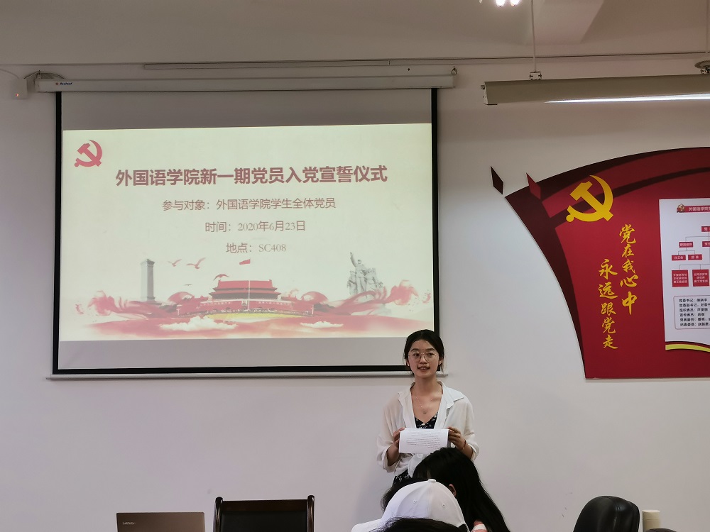 在建党99周年来临之际,为增强党员政治意识,坚定理想信念,6月23日晚,外国语学院党委组织22名新发展党员在SC408学院党员之家举行庄严神圣的入党宣誓仪式。学院党委组织委员、学生第一党支部书记芦美丽老师,学生党员代表一同参加了宣誓仪式。