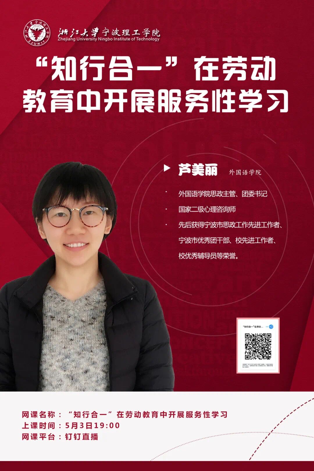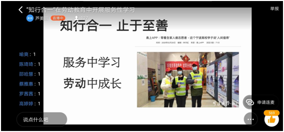 “劳动教育是中国特色社会主义教育制度的重要内容,直接决定社会主义建设者和接班人的劳动精神面貌、劳动价值取向和劳动技能水平,是培养时代新人的深切需要,高校作为劳动教育的重要主体之一,不仅要教育学生对知识躬身修行,更要教育学生用身体‘丈量’世界。”芦美丽老师由中共中央国务院发布的《关于全面加强新时代大中小学劳动教育的意见》为主轴,穿插王阳明的“知行合一”哲学思想,描述李子柒“劳作追梦”、何不食肉糜“晋惠帝”等生动例子,号召广大学生重视劳动教育,培养勤俭、奋斗、创新、奉献的劳动精神,形成良好的劳动习惯。讲座中,芦老师以学校宁波甬行码研发团队服务政府社会治理和学院学生党员蒋宁馨同学带着全家人做志愿者2个发生在身边的事例,鼓舞学生干部加强素质能力培养,以专业为基础开展服务性学习,彰显青春力量和时代担当。