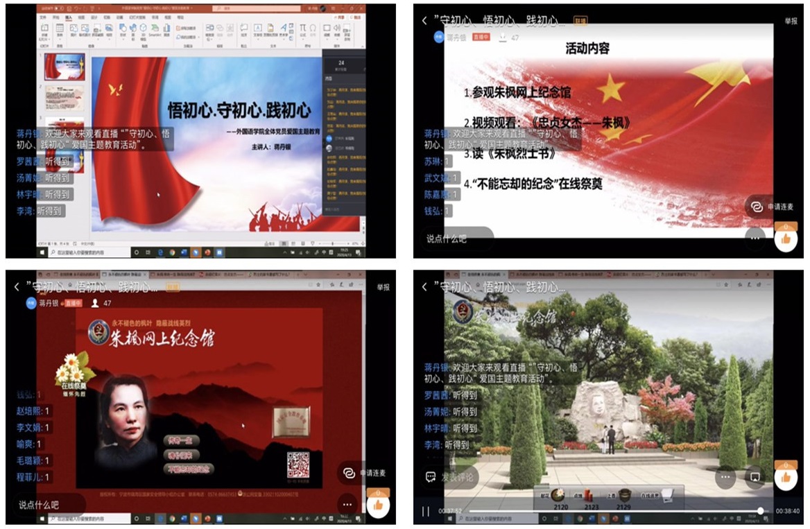 4月13日下午19点30分,为深入学习习近平总书记提出的“总体国家安全观”,迎接4.15全民国家安全日,外国语学院学生第一、第二党支部在钉钉线上开展“悟初心.守初心.践初心”爱国主题教育活动。学生第一、二支部书记芦美丽、刘杜娟参加。