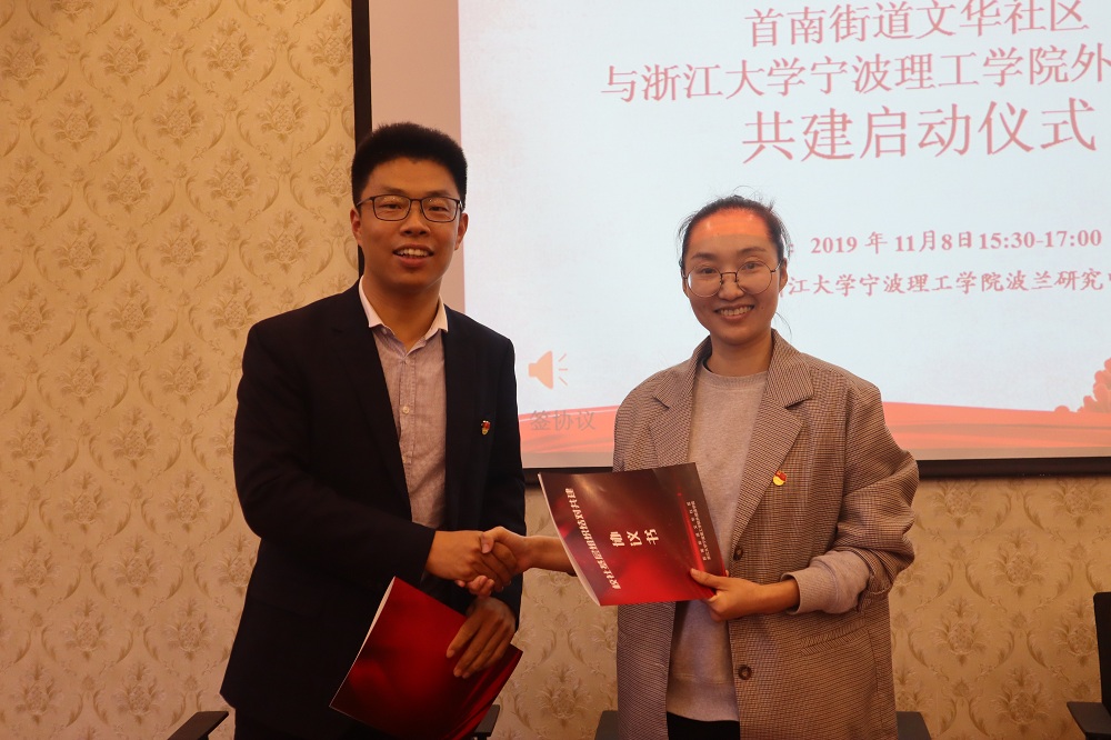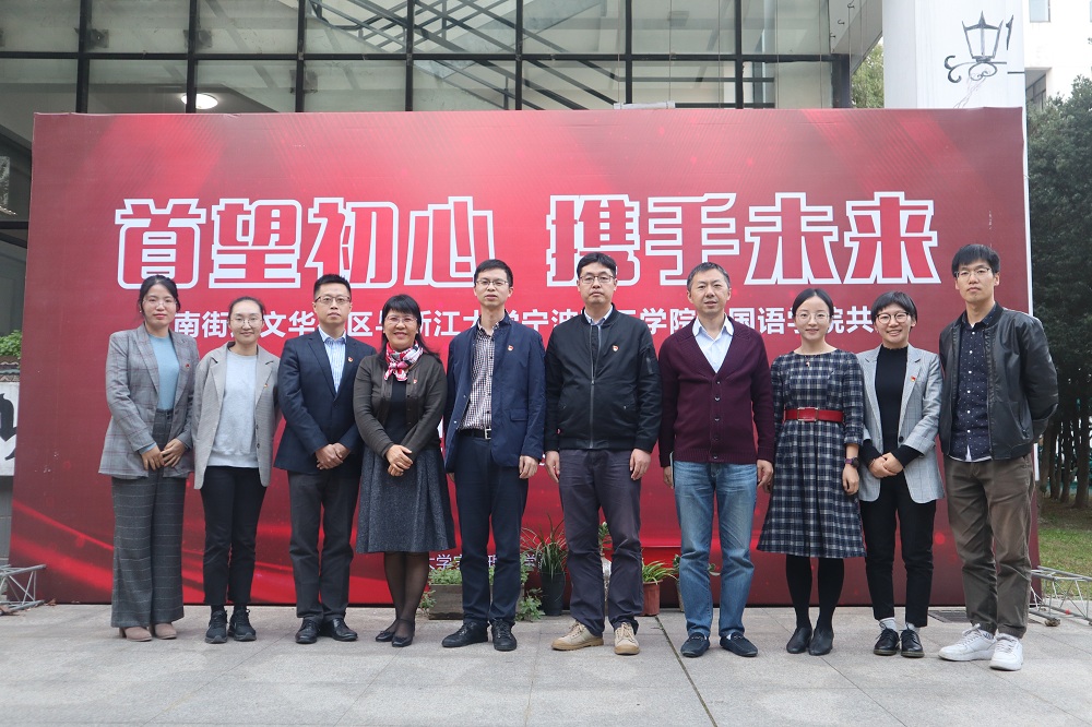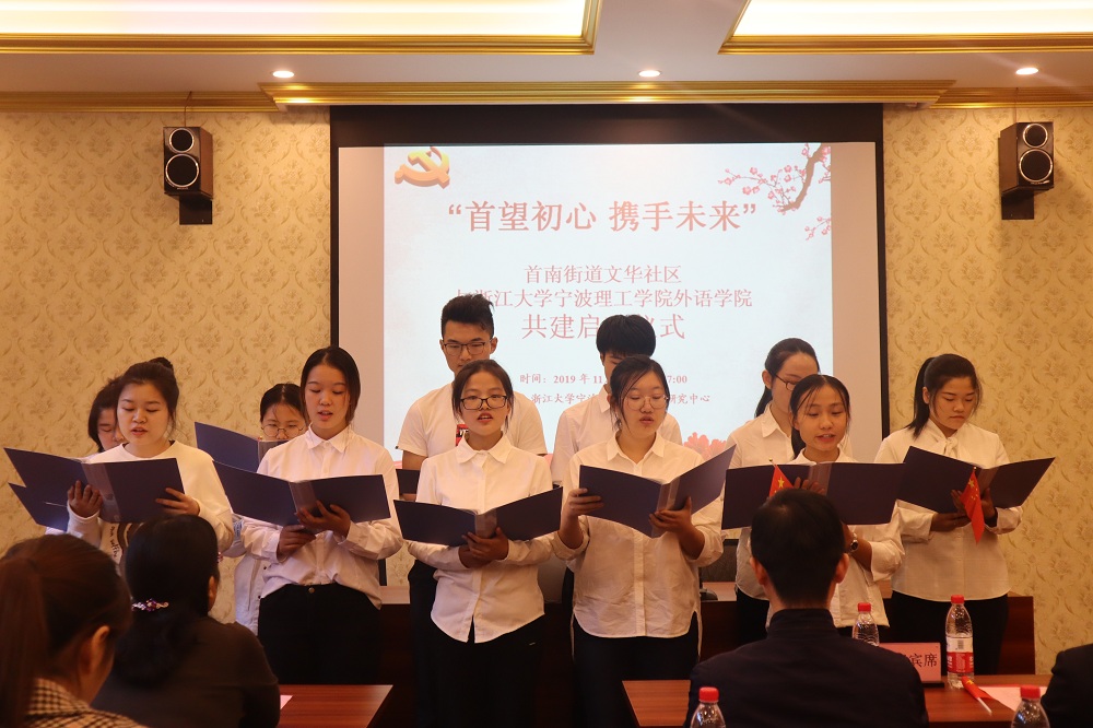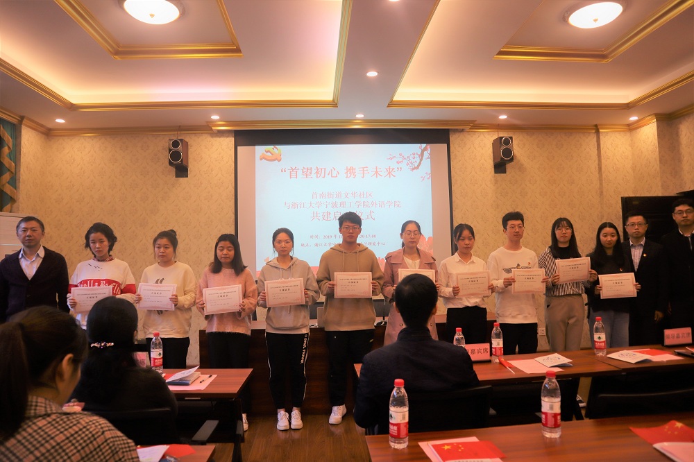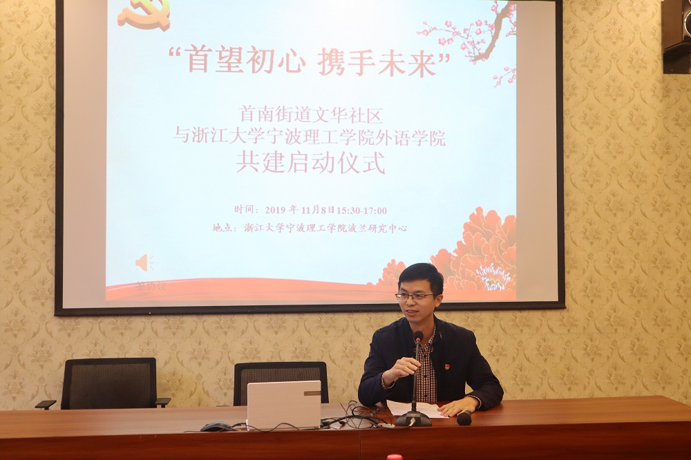活动伊始,首先由外国语学院党委副书记、学院副院长傅晓宇致辞,她指出,此次共建,首先是实现党建共建,文华社区党支部和浙江大学宁波理工学院外语学院学生党支部的长期共建;其次,是基地共建,基于双方的良好平台,继续深入发掘优质资源,实现多方位的互通;同时也关注文化共建,丰富的高校资源和浓厚的中西学术氛围相结合,既传承和发扬中国优秀传统文化,又吸收优秀西方文化,文化交融,共建文化。接着是首南街道党工委副书记周明峰讲话,他指出,首南街道文华社区所辖地区,高校资源丰富,有浓厚的学术气息及国际化氛围,加强社区和高校的交流,从而充分实现资源互通、学习互通、文化共建。