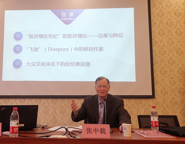 2019年10月24日下午,北京外国语大学英语学院教授,博士生导师张中载先生在浙江大学宁波理工学院波兰研究中心作题为“百年变革中的英语文学(1919-2019)”的学术讲座。本次讲座是随园讲坛第四十二期,由外国语学院副院长周汶主持。