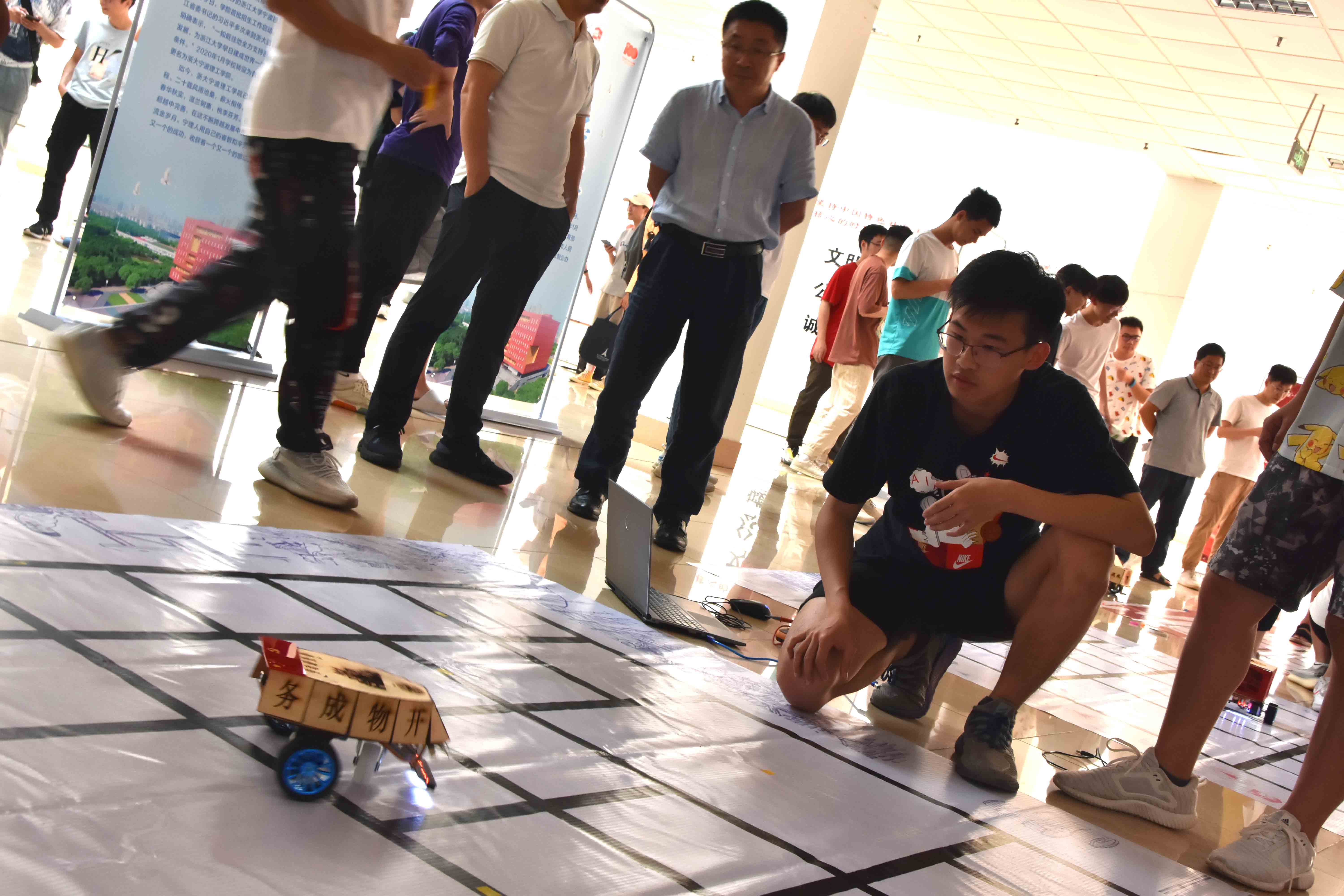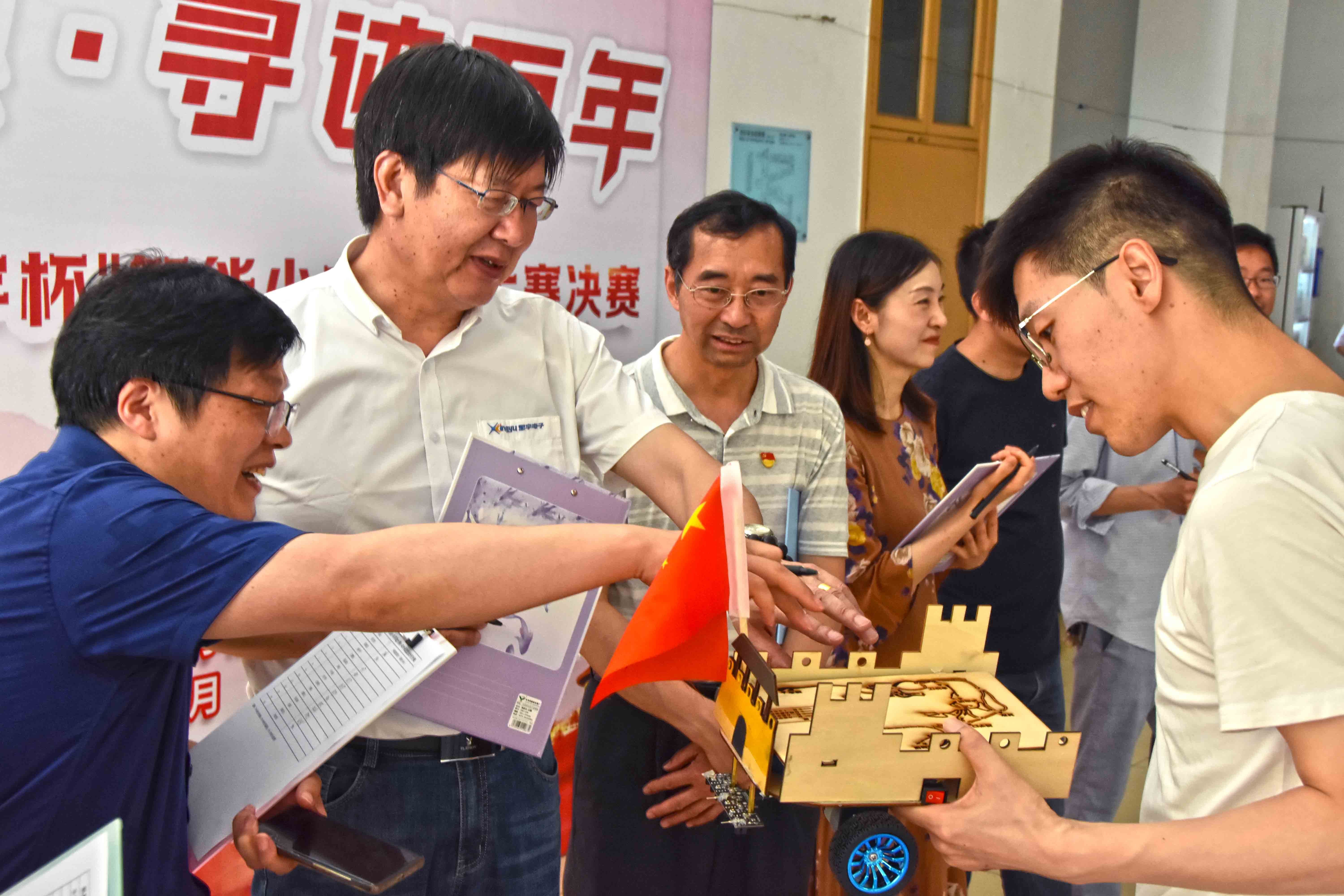 经过前期同学们的踊跃报名、自由组队、赛前培训、小车设计、编写代码、初赛,最终共有15支团队的小车作品脱颖而出,入围决赛。决赛分为两个环节:第一环节为小车外观造型设计评比,各参赛小组根据赛道主题设计小车造型,并向现场评委、观众介绍其小车设计理念和意义。第二环节为实战竞技环节,四个主题赛道上分别设置10个气球,代表十个关卡,比如长征赛道设置“四渡赤水”、“巧渡金沙江”、“飞夺泸定桥”等关卡,各参赛小组事先编写代码设定小车的寻迹路线,在规定时间内完成主题赛道上撞破气球过关卡的任务,每扎破一个气球得8分。