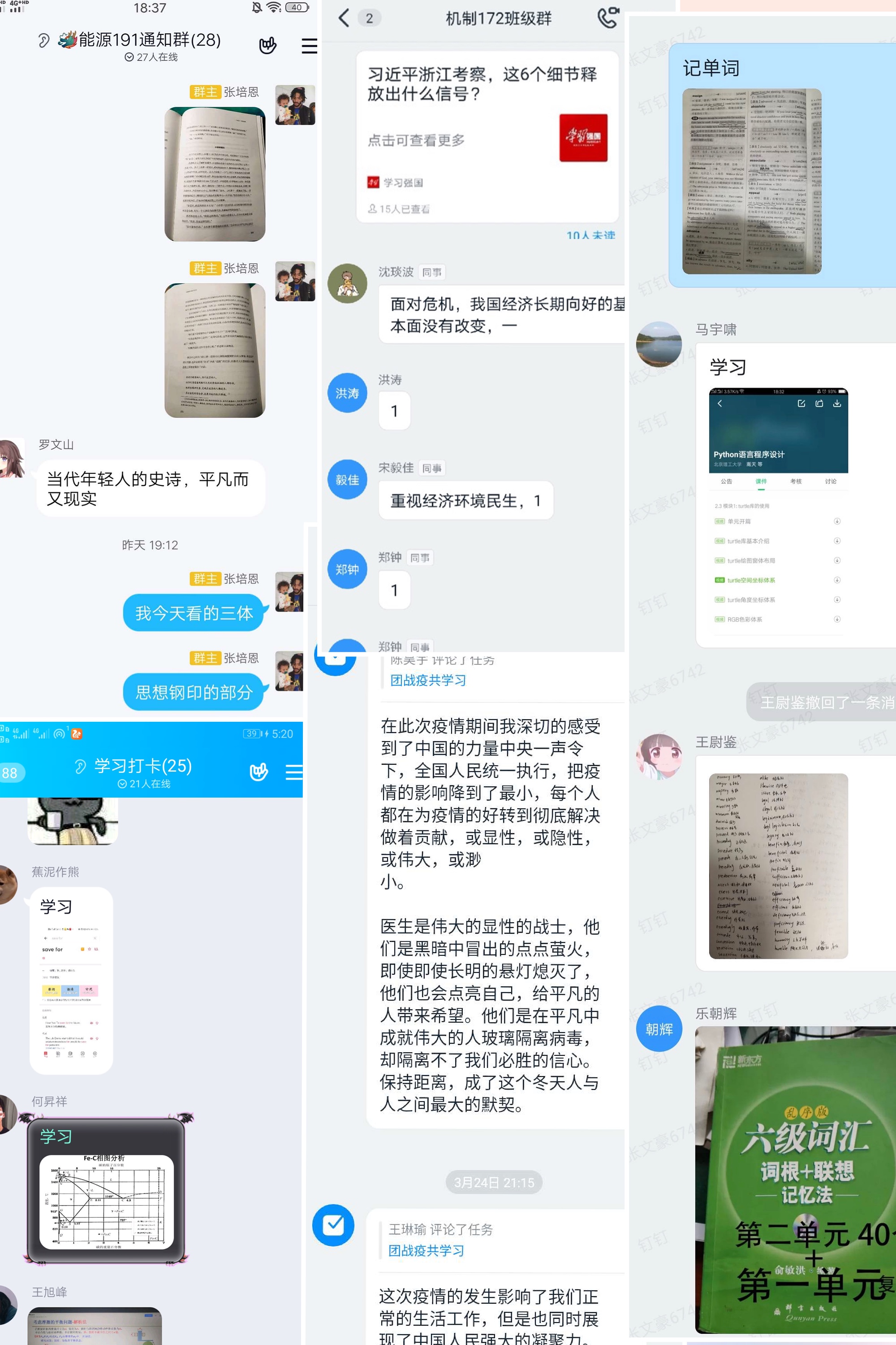 机制182班长在班级学习打卡总结中写道:“让我觉得比较惊讶的是,大部分的同学都会在睡前完成一天的学习任务后上传截图,有一些新的软件,以及他们研究的新的方向是我都不曾见过的。”各班互帮互助、共同学习的氛围,为每一个同学的“宅家”学习增加了动力和乐趣,也为学院营造优良学风打下了扎实基础。