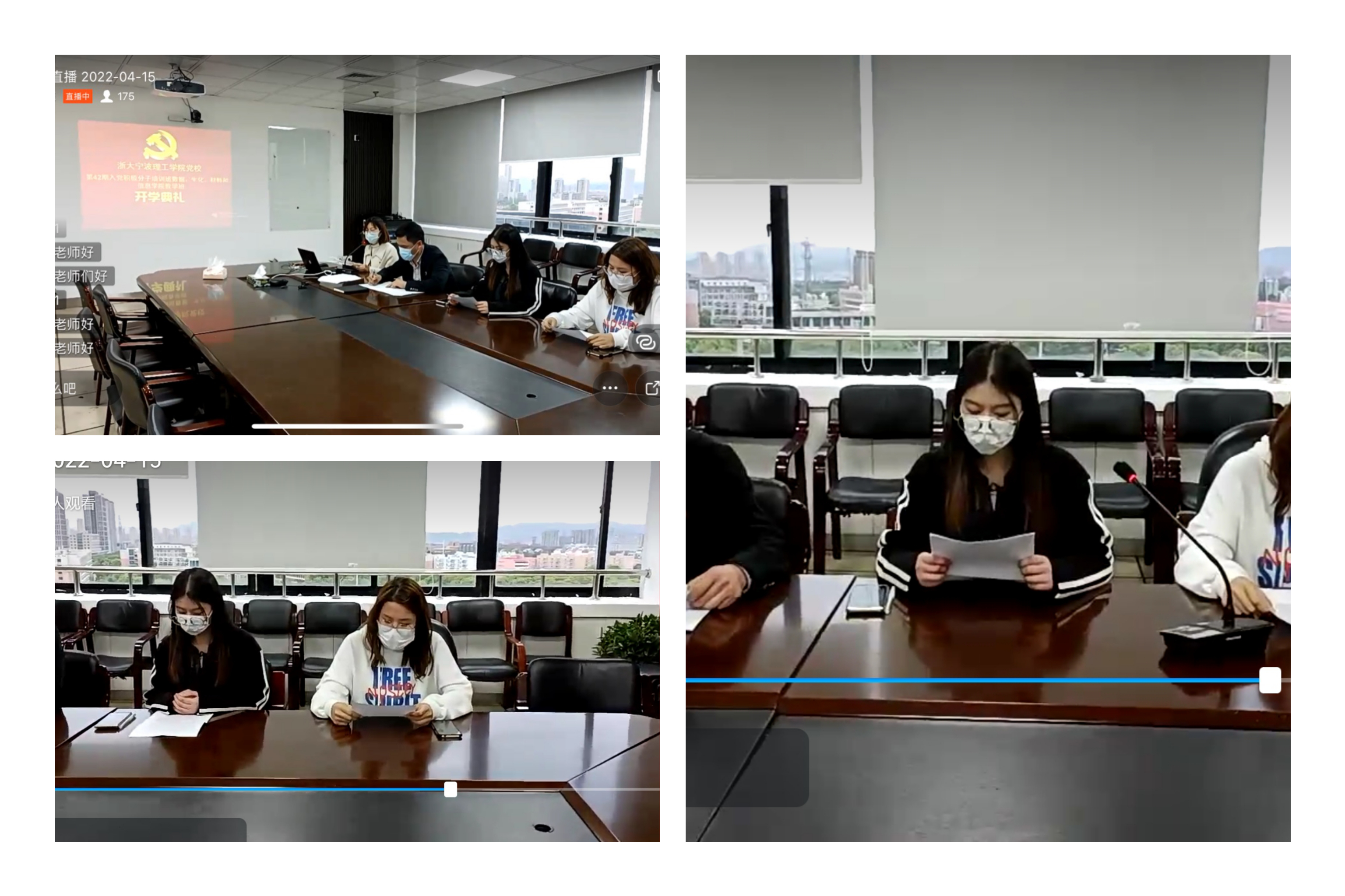 4月15日,党校第42期入党积极分子培训班生化学院党委、数据学院党委、材料学院党委和信息学院党委联合教学班顺利开班。根据疫情防控工作要求,本次开班典礼及培训采用线上直播方式。生化学院党委副书记楼文军、数据学院思政主管王常青、生化学院思政副主管闫雪茹、材料学院思政副主管包静昇出席了此次开班典礼。仪式由信息学院董俊娜主持。