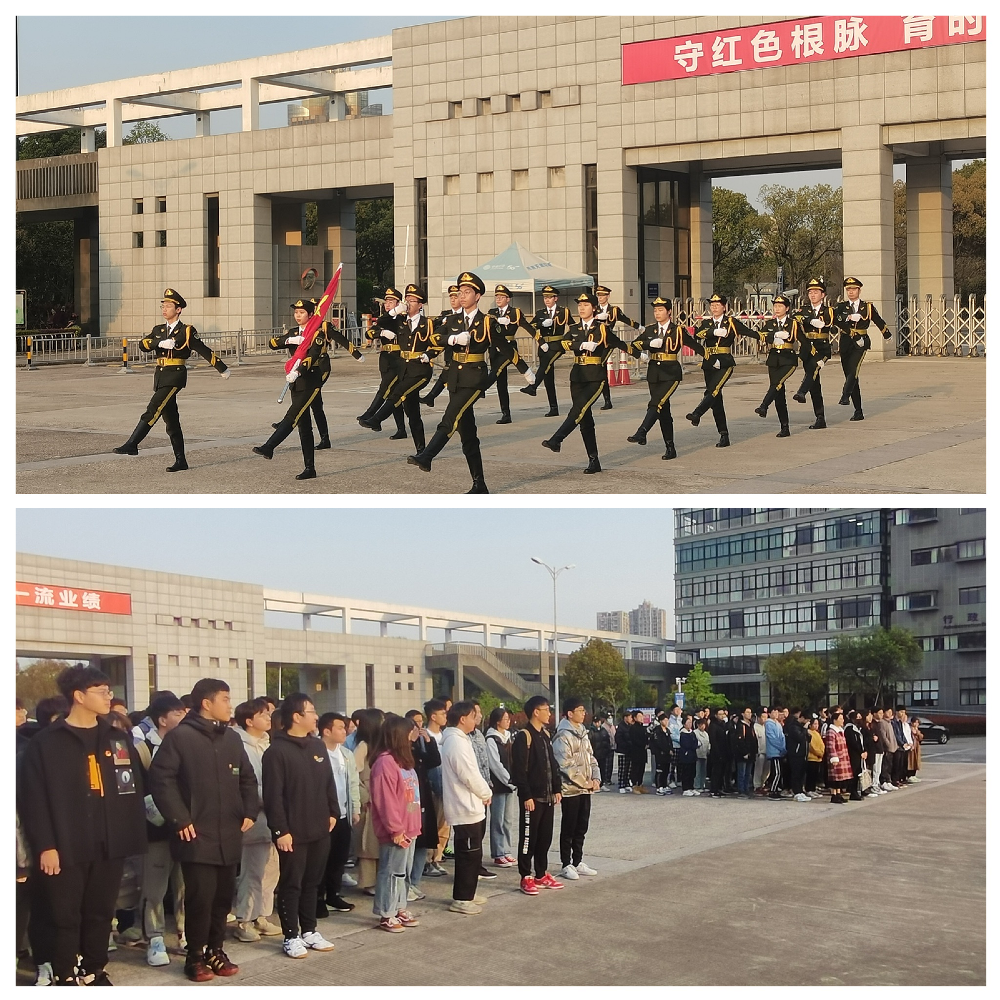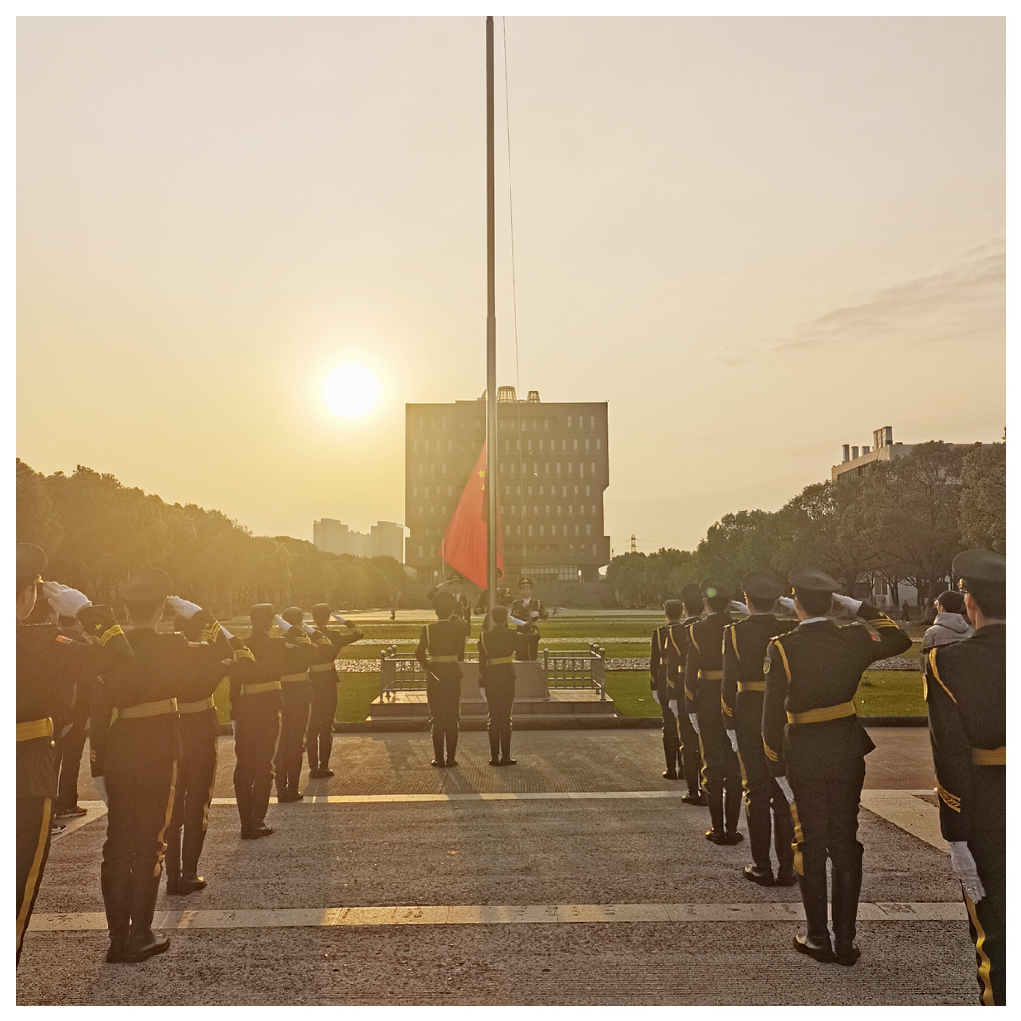 迎着初升的太阳,英姿飒爽的国旗护卫队队员们迈着铿锵有力、整齐划一的步伐护送国旗来到旗杆下。伴随着庄严的国歌,升旗手振臂一挥,所有人肃立,向国旗行注目礼,鲜艳的五星红旗徐徐展开,在晨曦中迎风飘扬在浙大宁理的上空。