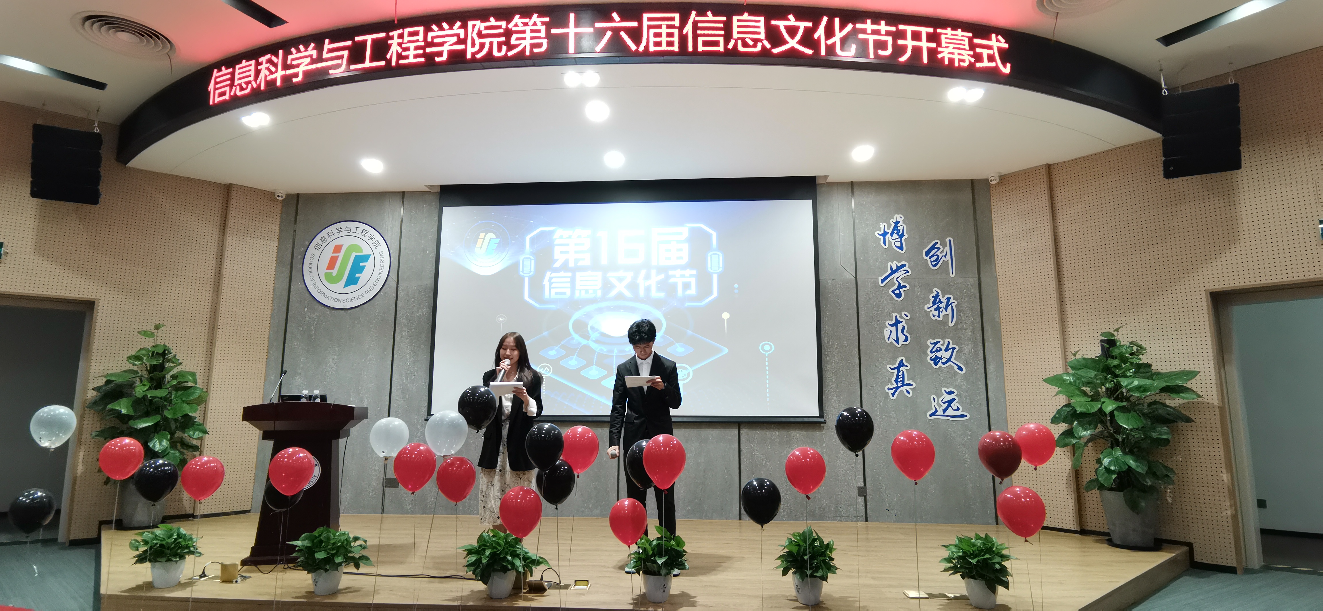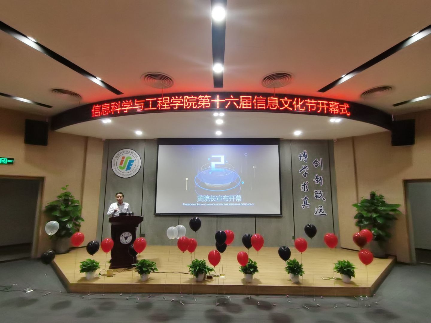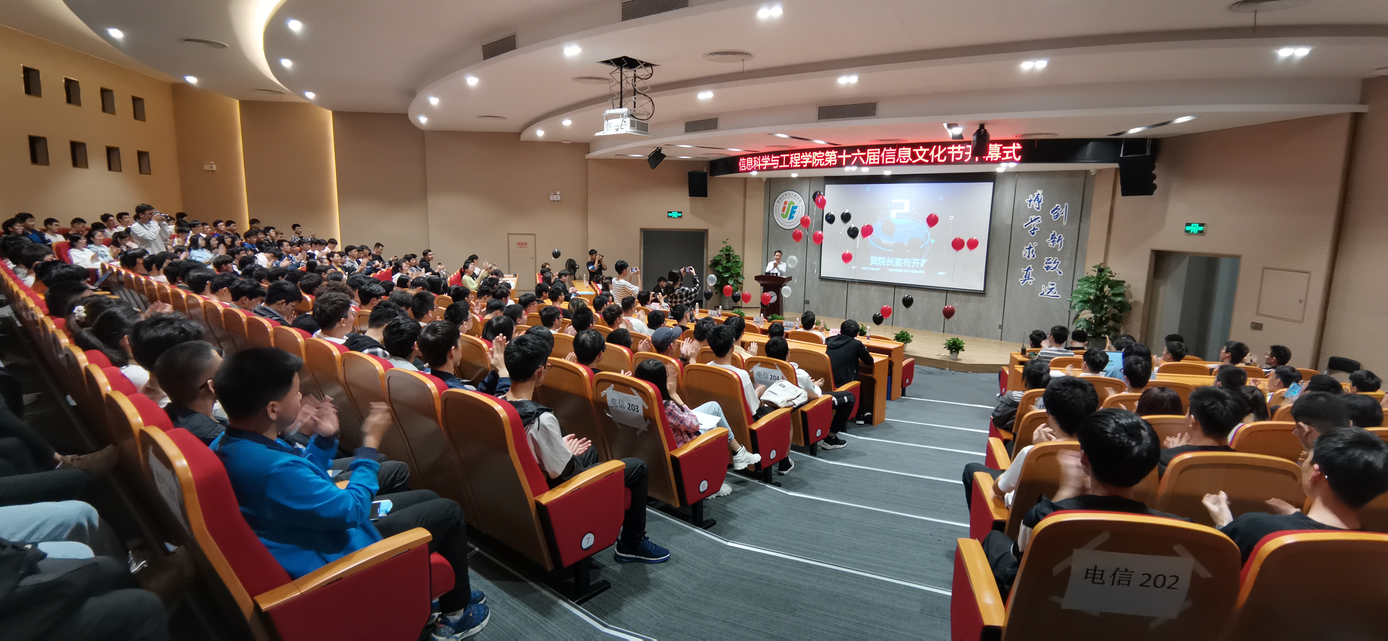 11月19日晚18:30,信息学院第十六届信息文化节开幕仪式在启新大讲堂举行。信息学院院长黄进、副院长裘君、党委副书记方芳、学工办主管杜明珠、学工办副主管董俊娜、团委书记金智展、团学青干部及全体2020级新生参加。