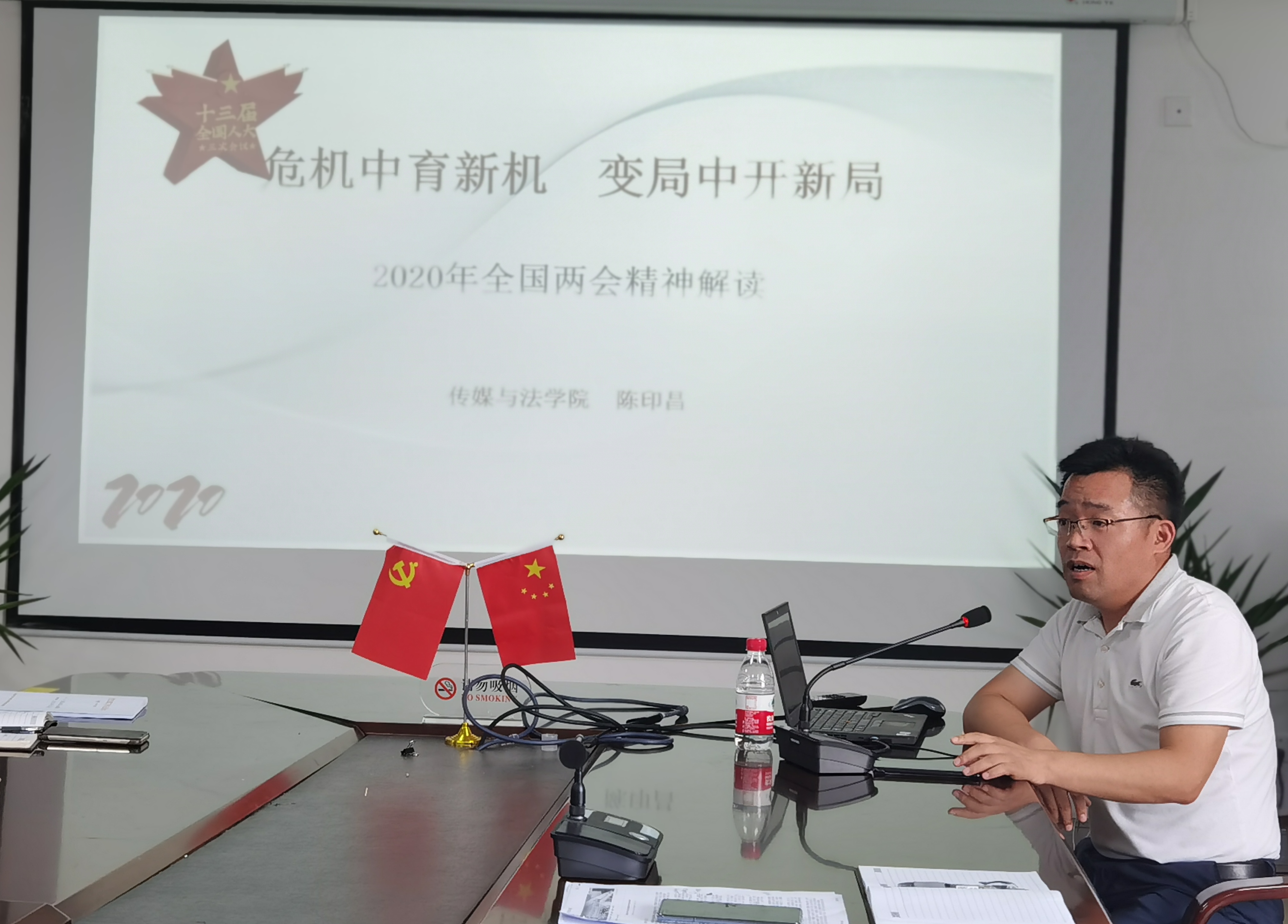 6月28日,信息学院“党课开讲啦”活动在石麟9楼会议室举行,本次活动特邀传媒与法学院陈印昌老师作2020年全国两会精神解读的报告。学院党委书记应中元主持,学院全体教工党员和学生党员代表参加了活动。