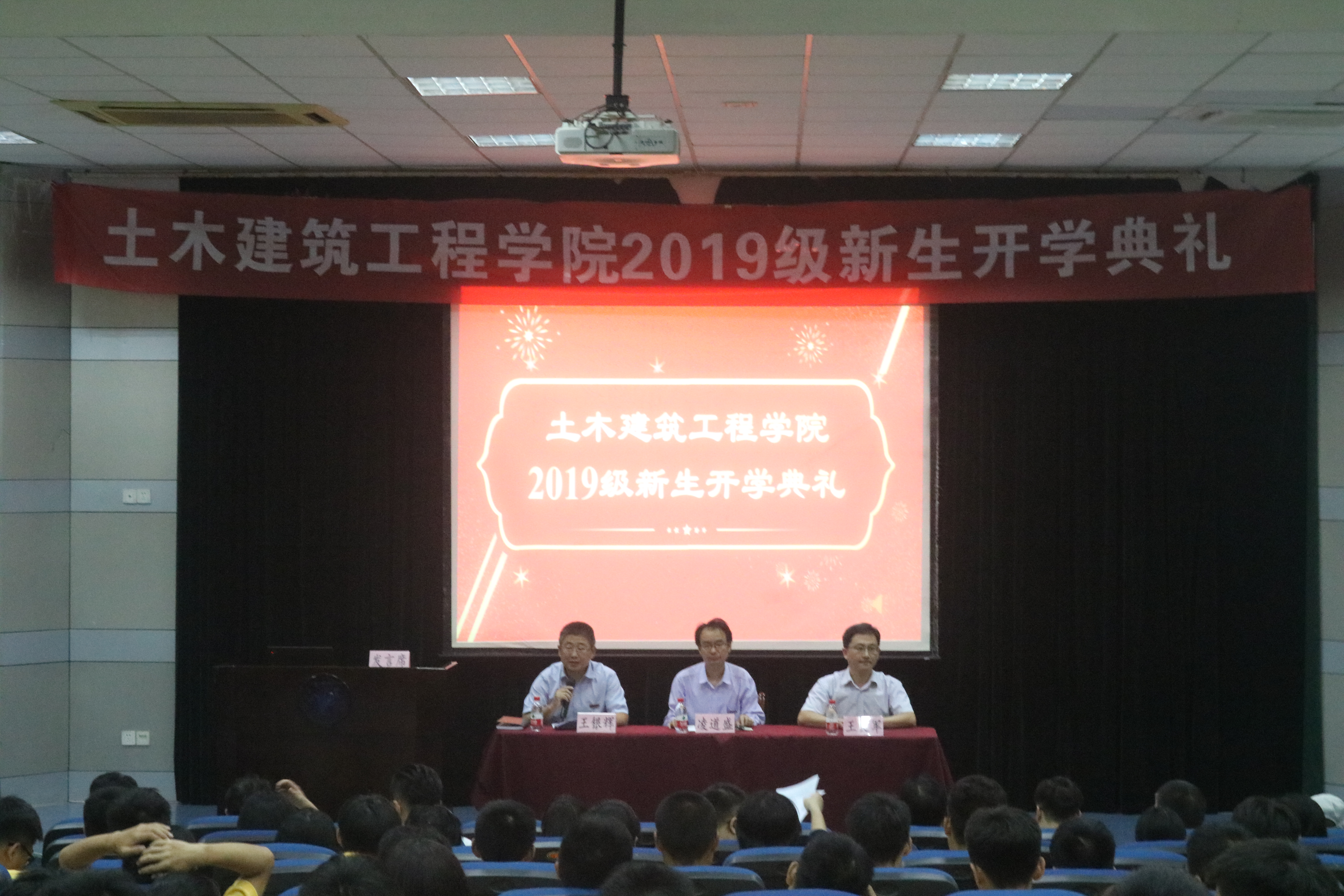 2019年9月8日18:30,土木建筑工程学院2019级学生开学典礼在NF103开展,土建学院院长凌道盛、土建学院党委书记王银辉、副院长王文军、各研究所负责人、党政办及学工办人员、2019级班导师和班导师助理以及全体2019级新生参与,典礼由党委书记王银辉主持。