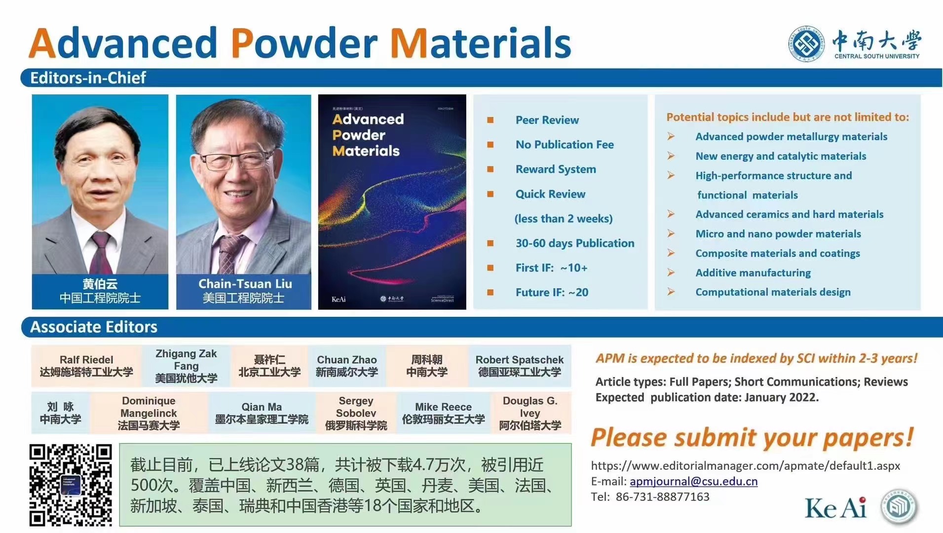 Advanced Powder Materials (先进粉体材料),简称APM,是由中南大学粉末冶金国家重点实验室和粉末冶金国家工程研究中心承办,中南大学与科爱合作,于2021年7月创立的英文学术期刊,2022年1月发表第一卷第一期,国际刊号为ISSN: 2772-834X。两位主编中,黄伯云为中南大学教授、中国工程院院士,刘锦川为香港城市大学教授、美国工程院院士。