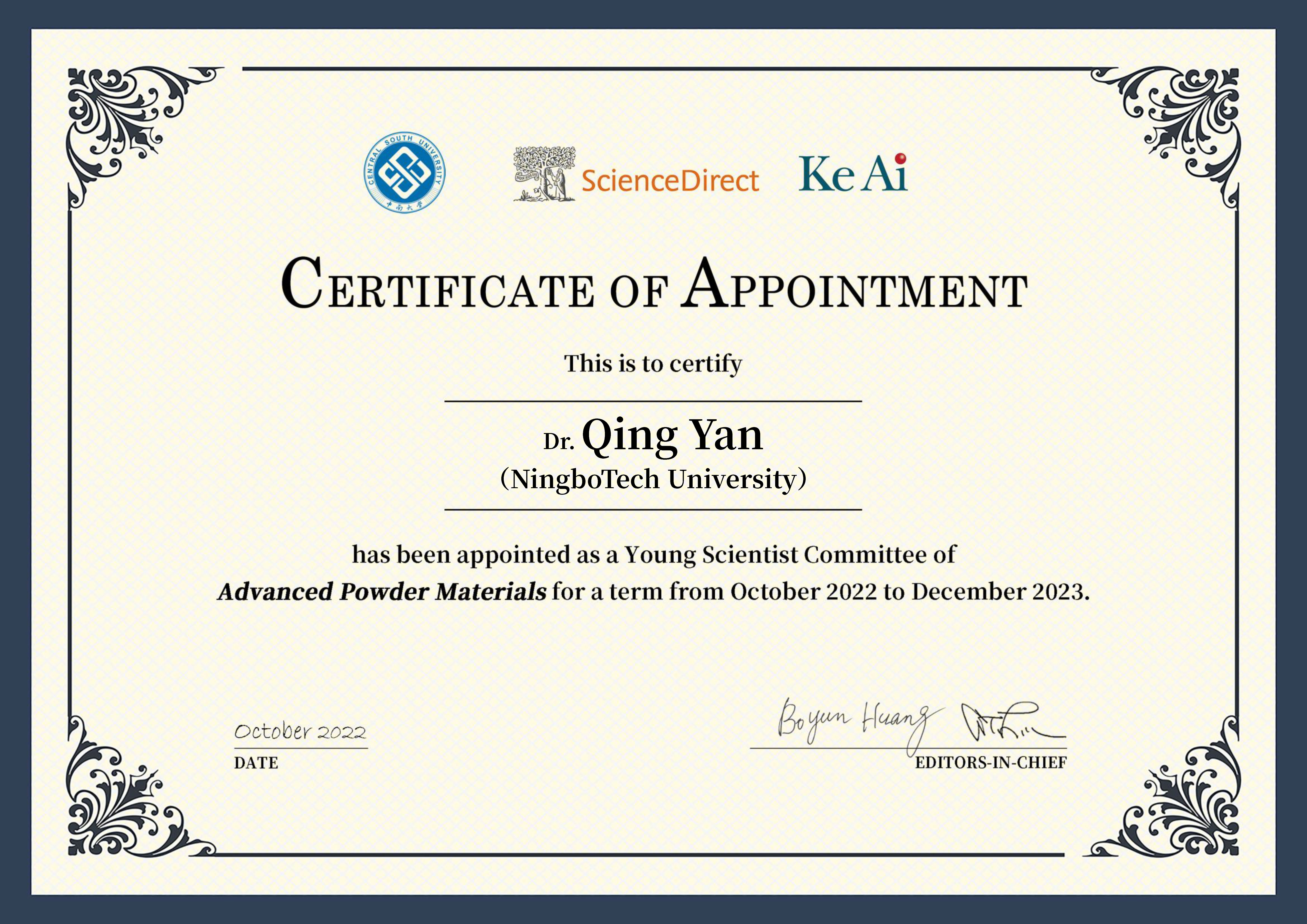 近日,开云生化学院青年教师闫卿博士应《Advanced Powder Materials》编辑部的邀请,担任该刊青年编委,任期1年。