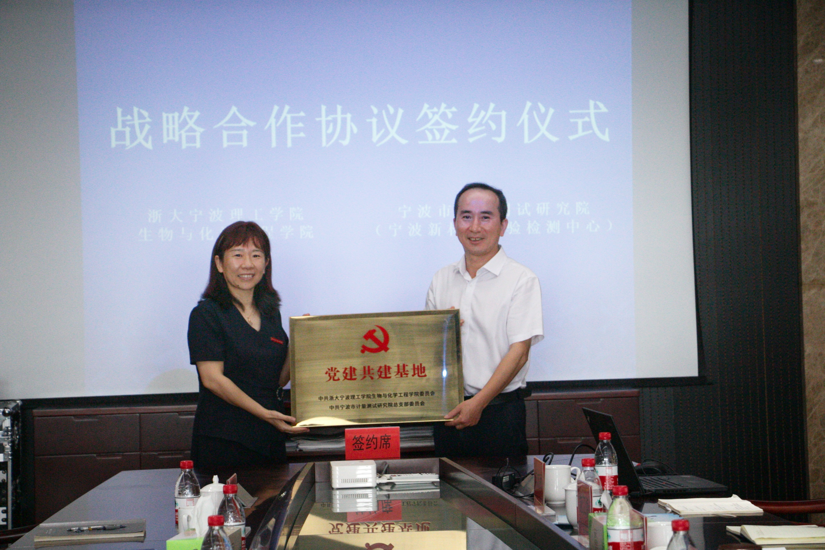 △生化学院党委副书记王常青与宁波市计量测试研究院副院长王一民共同为“党建共建基地”揭牌