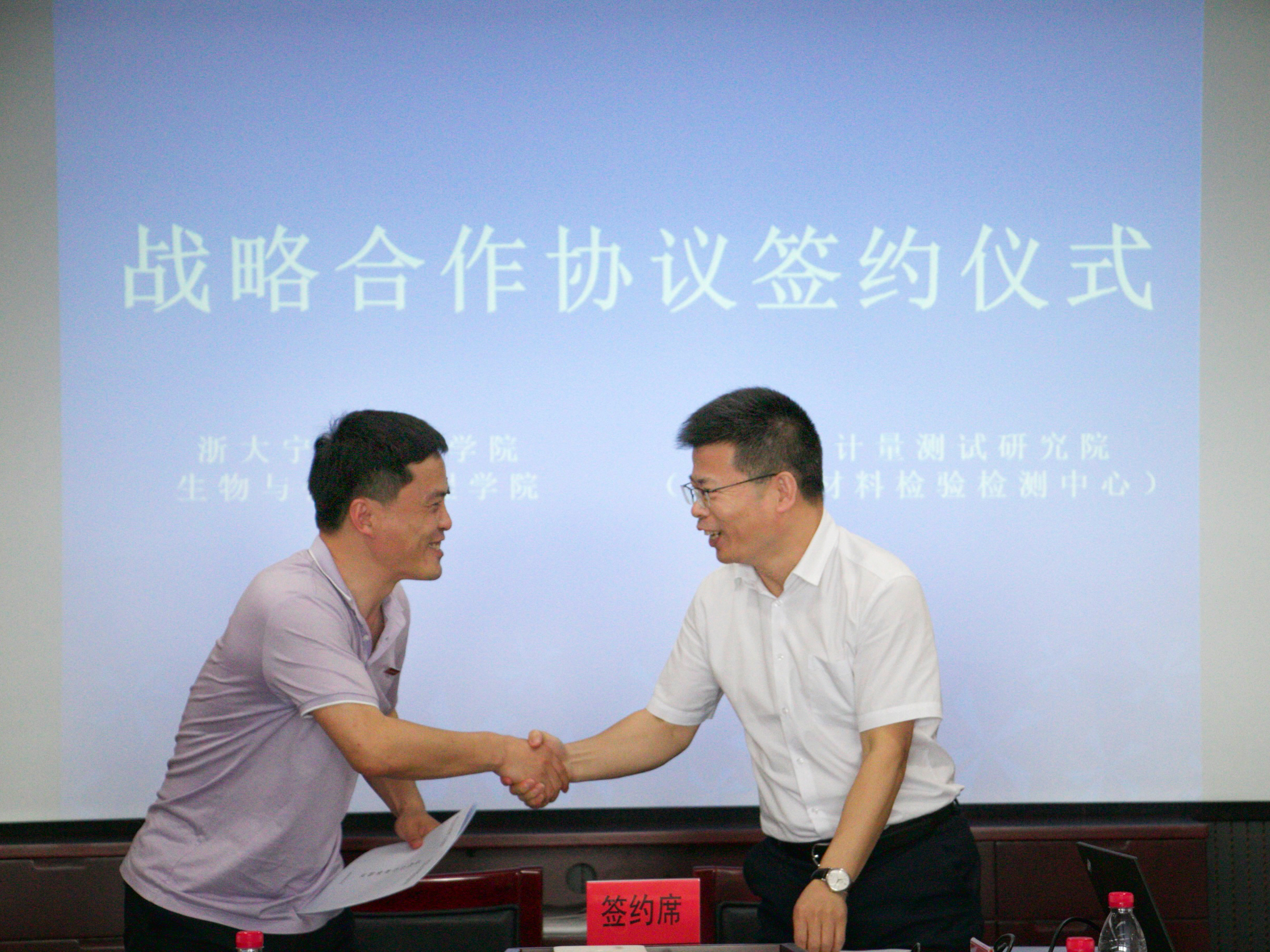 △生化学院党委副书记(主持)楼文军与宁波市计量测试研究院院长岑志波共同签订战略合作协议并为“产学研合作基地”揭牌