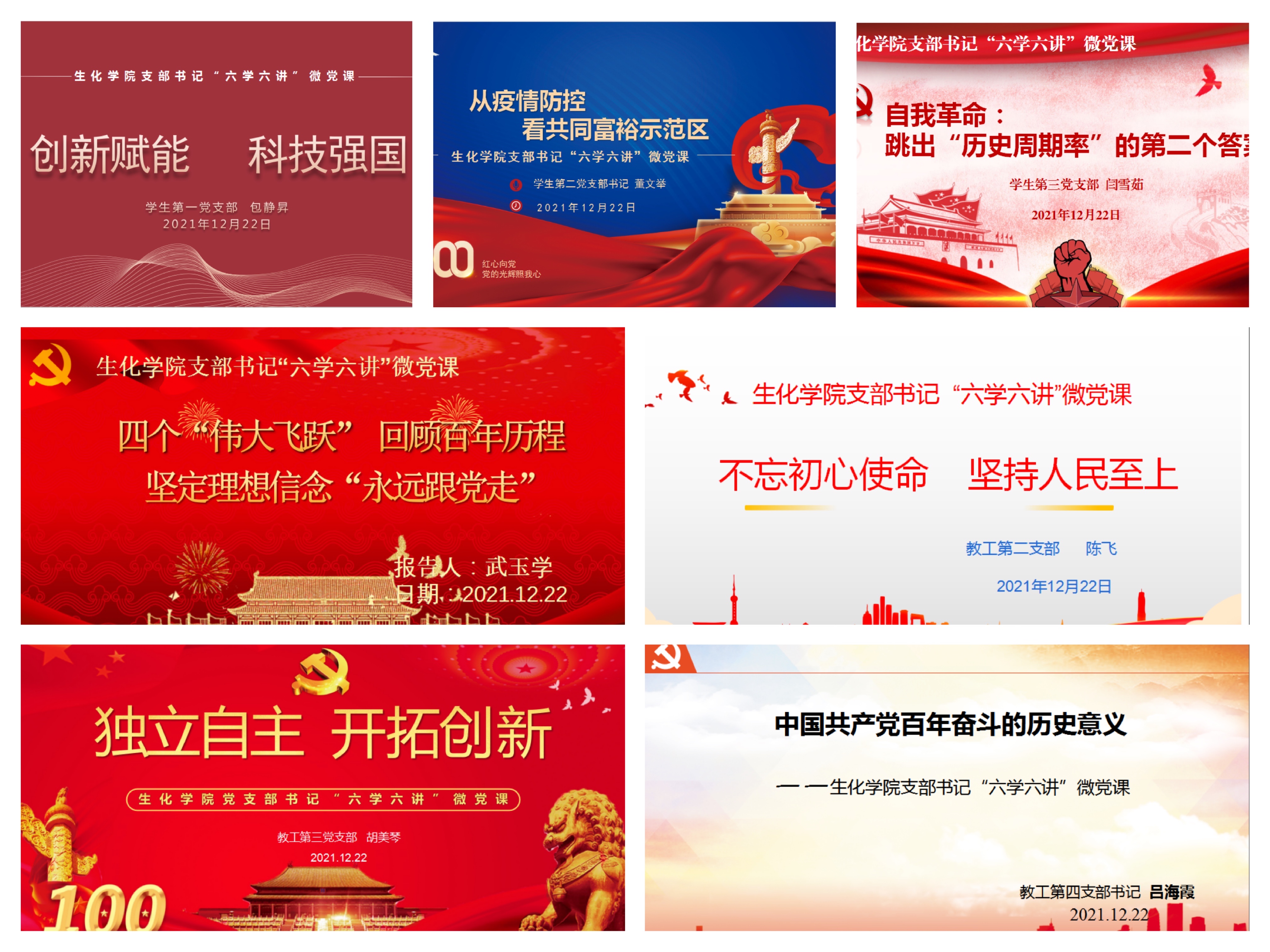 根据《中共开云kaiyun官网委员会关于深入学习宣传贯彻党的十九届六中全会精神的通知》要求,生化学院加强顶层设计,通过专题研讨学、理论宣讲学、课程思政学、实践应用学、趣味答题学等形式在学院、支部层面开展“六学六讲”。12月22日下午,生化学院在SB102开展支部书记“六学六讲”微党课宣讲。师生党支部共7位教师面向“青苗计划”新生入党启蒙班的学员从各个维度宣讲党的十九届六中全会精神。