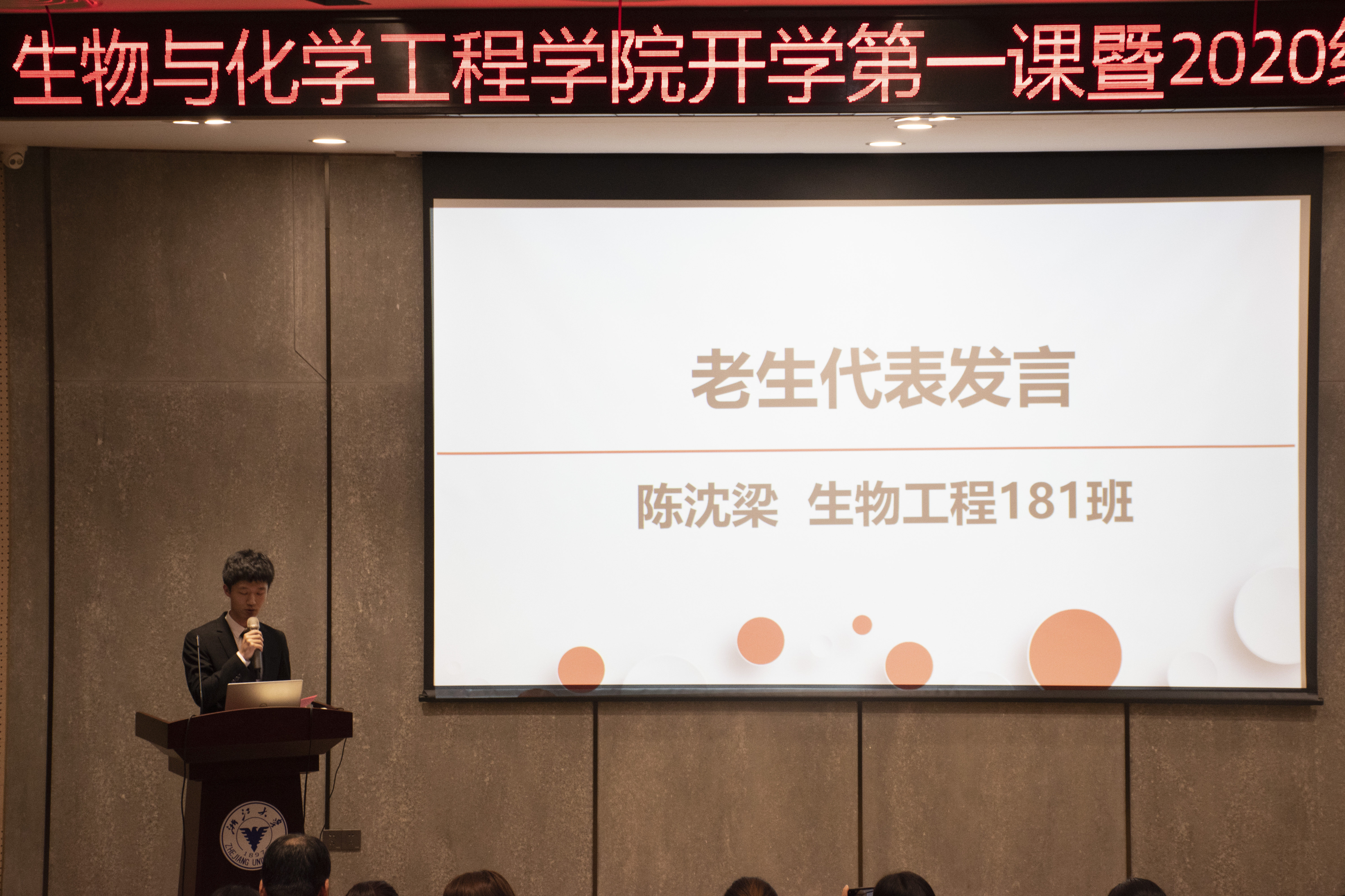 10月20日晚,生化院开学第一课暨2020级新生开学典礼在启新大讲堂举行。参加本次开学典礼的有学院院长方征平、党委书记楼文军、副院长沈昊宇、各专业负责人、新生班导师、生化学院全体辅导员及2020级新生,本次大会由学院党委副书记赵涵主持。