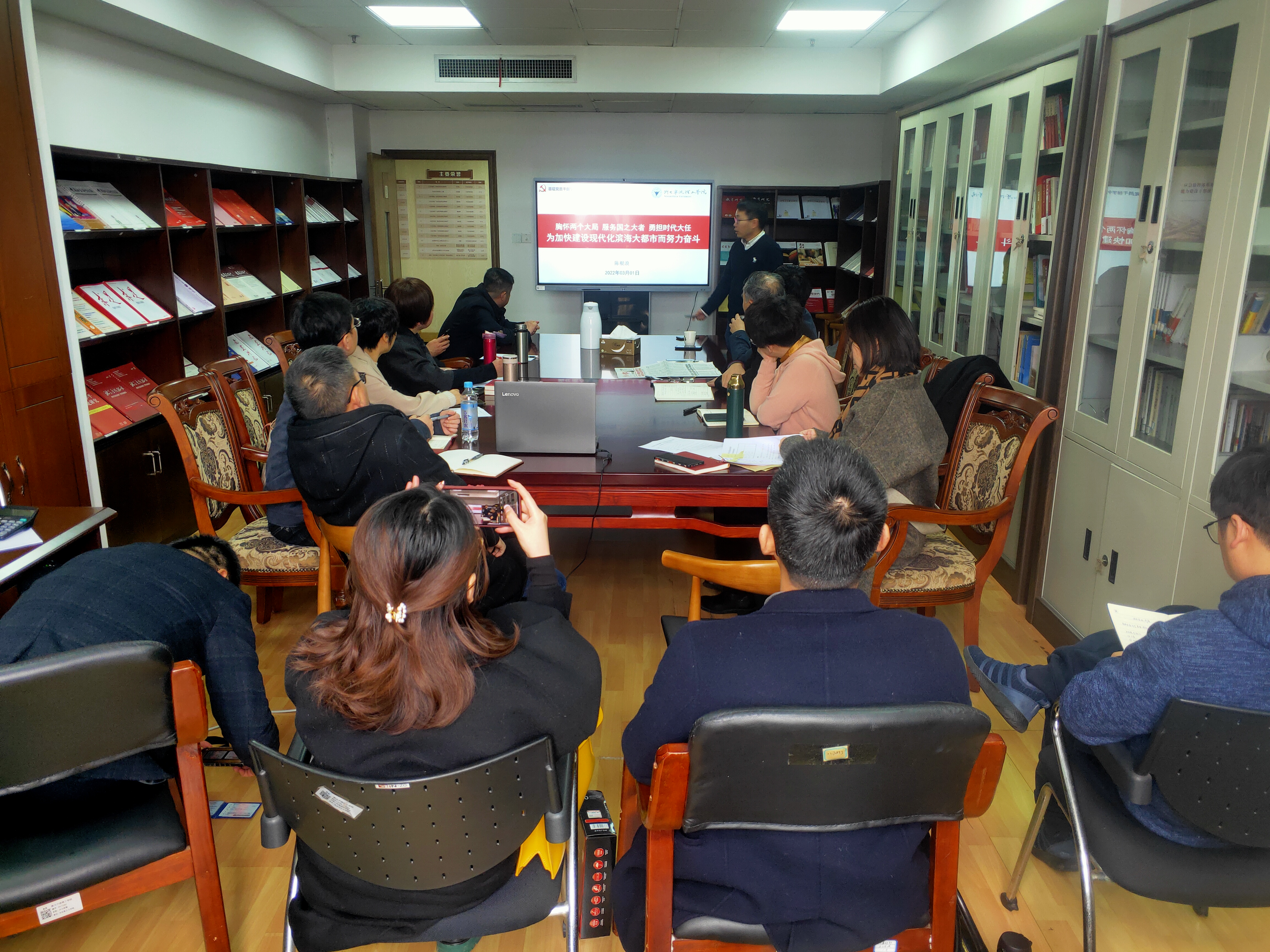 3月1日中午,马克思主义学院在901会议室召开3月份理论学习中心组(扩大)会议,会议邀请宁波市第十四次党代会代表、数据学院副院长陈根浪教授为全体教师传达宁波第十四次党代会会议精神。