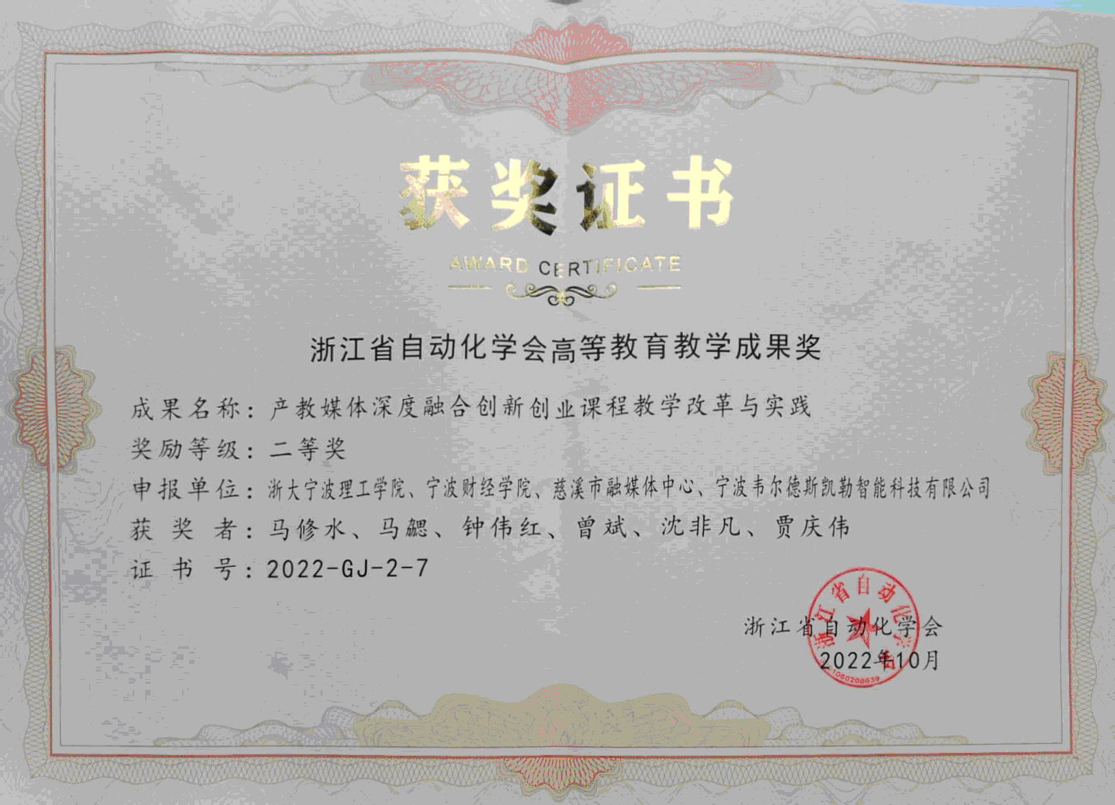 近日,第16届浙江省高校自动化类专业院长、系主任论坛在衢州召开。会上宣布了2022年浙江省自动化学会高等教育教学成果奖,开云马修水、钟伟红等教学团队负责的“产教媒体深度融合创新创业课程教学改革与实践”项目荣获浙江省自动化学会教学成果二等奖。