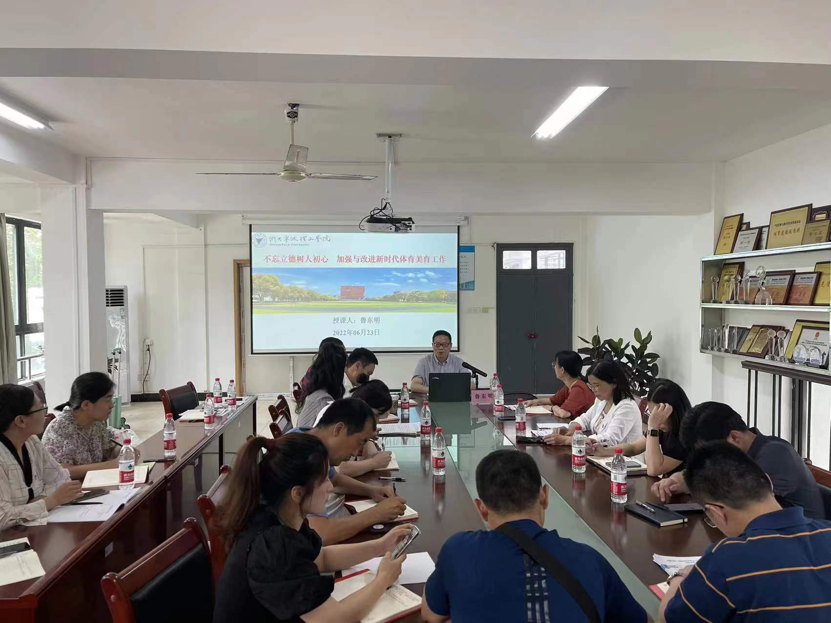 鲁东明以“不忘立德树人初心 加强与改进新时代体育美育工作”为主题,从深刻认识新时代体育美育工作的重要意义、全面把握新时代体育美育工作的丰富内涵、创新探索新时代体育美育工作的宁理模式三个方面给全体教师上了一堂生动有内涵的党课。鲁东明指出,学校体育是实施立德树人根本任务的基础性工程,学校美育是实现立德树人的重要载体,我们要立足需求,更新理念、丰富资源,不断完善体美育人新标杆;凝心聚力,多方协同、五育并举,逐步构建体育美育新格局;特色发展,点面结合、典型塑造,持续营造校园体美新文化;改革创新,优化机制、完善评价,探索建立活力高效新模式。最后引用习近平总书记的话“要从党和国家事业发展的高度,努力培养担当民族复兴大任的时代新人”勉励大家不忘立德树人初心,为学校的体育美育工作积极奉献。