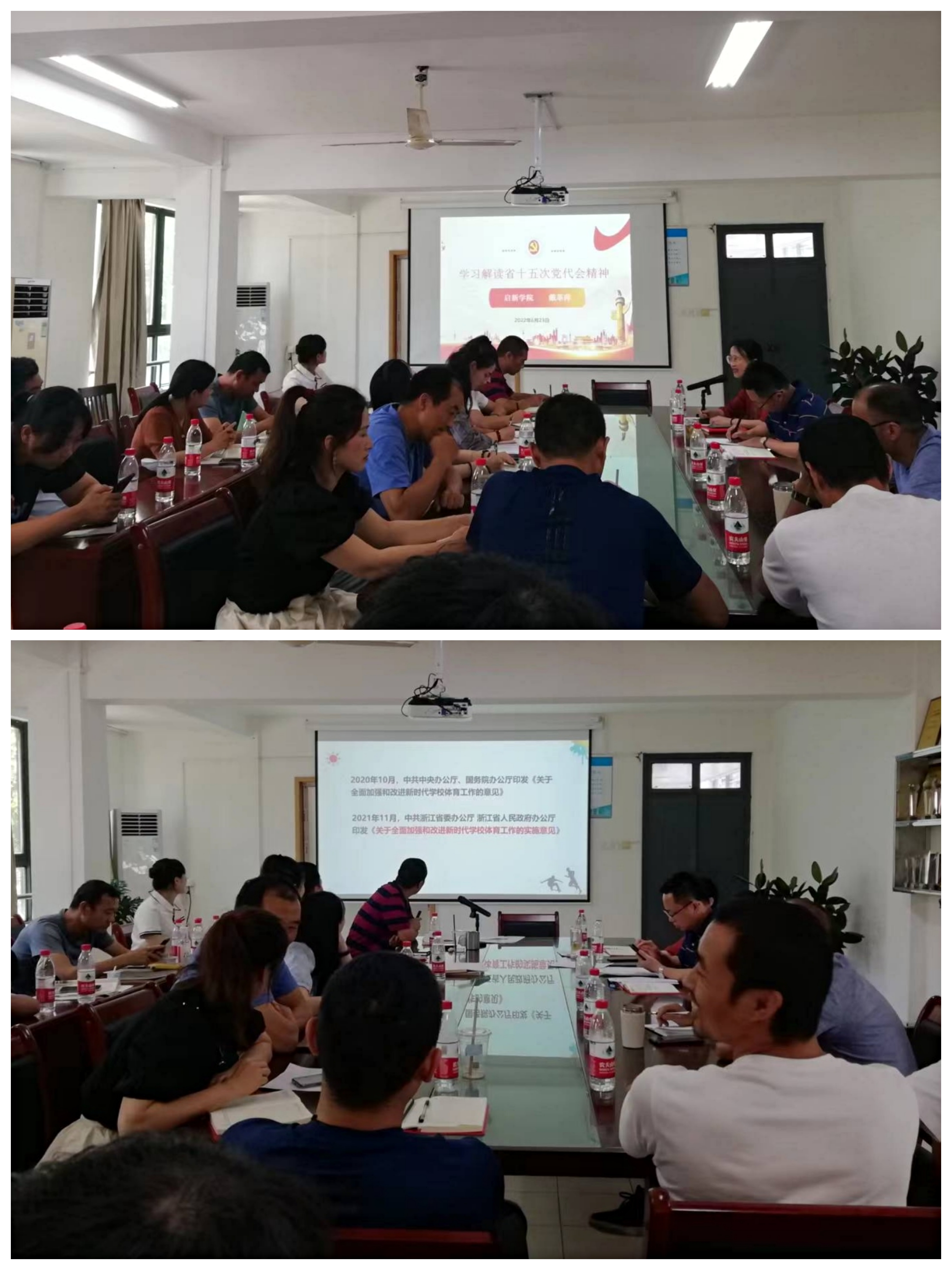 戴革萍解读了浙江省第十五次党代会精神,启新学院副院长朱天明解读了中共浙江省委办公厅 浙江省人民政府办公厅印发的《关于全面加强和改进新时代学校体育工作的实施意见》,艺术教师王涵解读了中共浙江省委办公厅 浙江省人民政府办公厅印发的《关于全面加强和改进新时代学校美育工作的实施意见》。