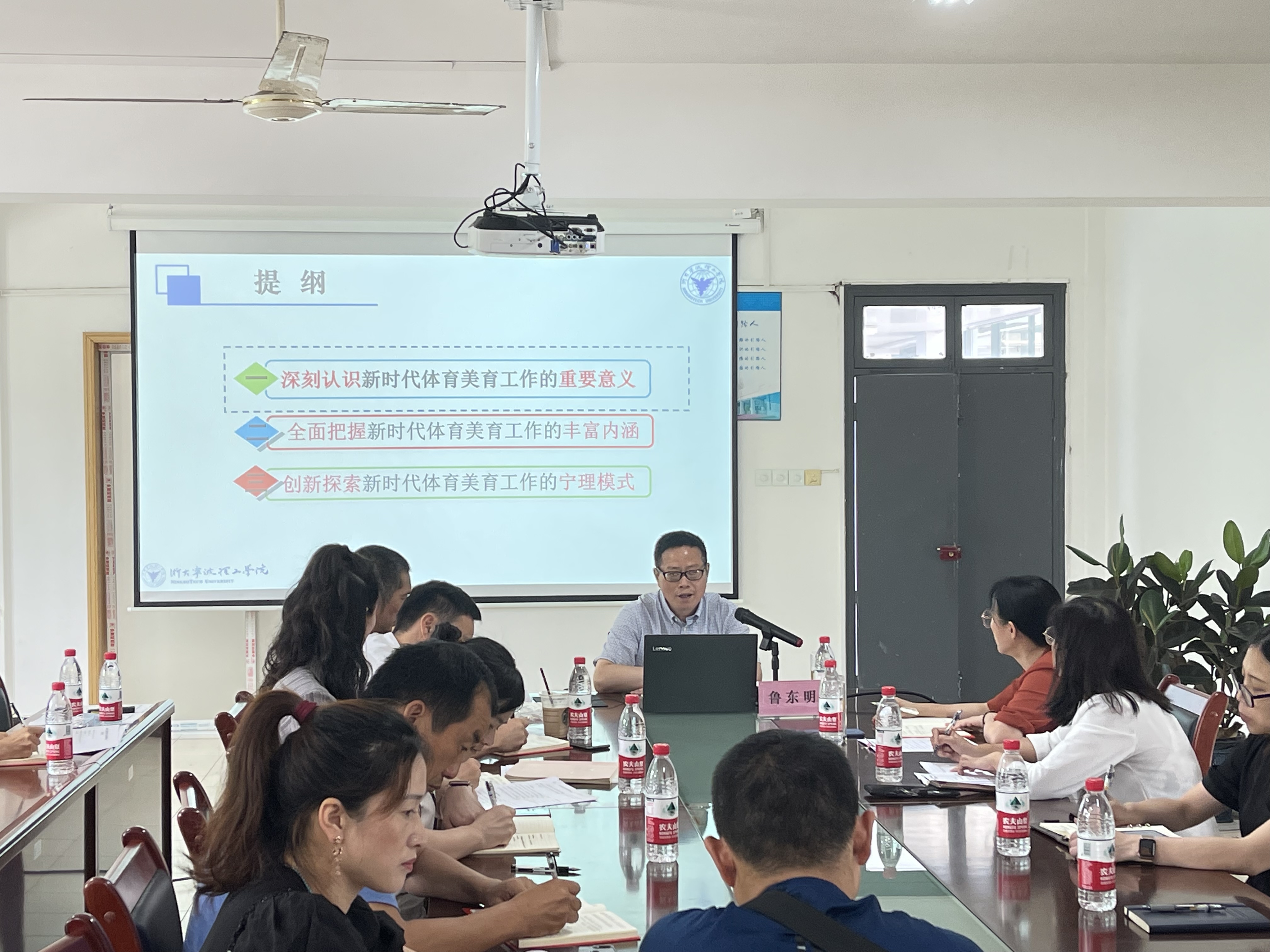 会前,特邀学校党委委员、副校长鲁东明作了题为《不忘立德树人初心 加强与改进新时代体育美育工作》的报告,鲁东明从深刻认识新时代体育美育工作的重要意义、全面把握新时代体育美育工作的丰富内涵、创新探索新时代体育美育工作的宁理模式三个方面给全体教师上了一堂生动有内涵的课,指引大家要立足需求,更新理念、丰富资源,不断完善体美育人新标杆;凝心聚力,多方协同、五育并举,逐步构建体育美育新格局;特色发展,点面结合、典型塑造,持续营造校园体美新文化;改革创新,优化机制、完善评价,探索建立活力高效新模式。最后引用习近平总书记的话“要从党和国家事业发展的高度,努力培养担当民族复兴大任的时代新人”勉励大家不忘立德树人初心,为学校的体育美育工作积极奉献。