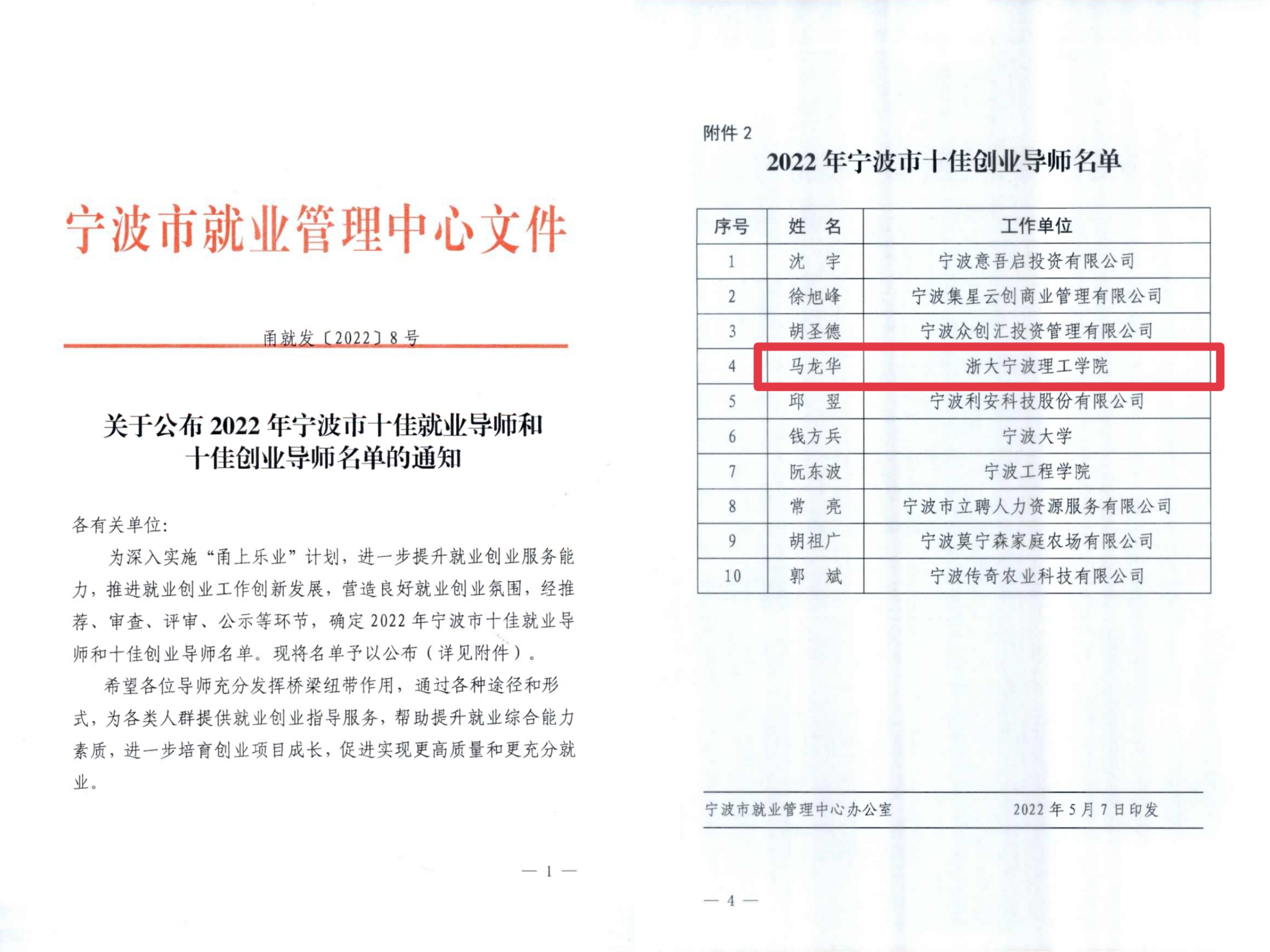 2022年5月7日,宁波市就业管理中心(宁波市创业指导中心)发文公布了2022年宁波市十佳就业导师和十佳创业导师名单,开云推荐的创业导师马龙华教授入选宁波市十佳创业导师。