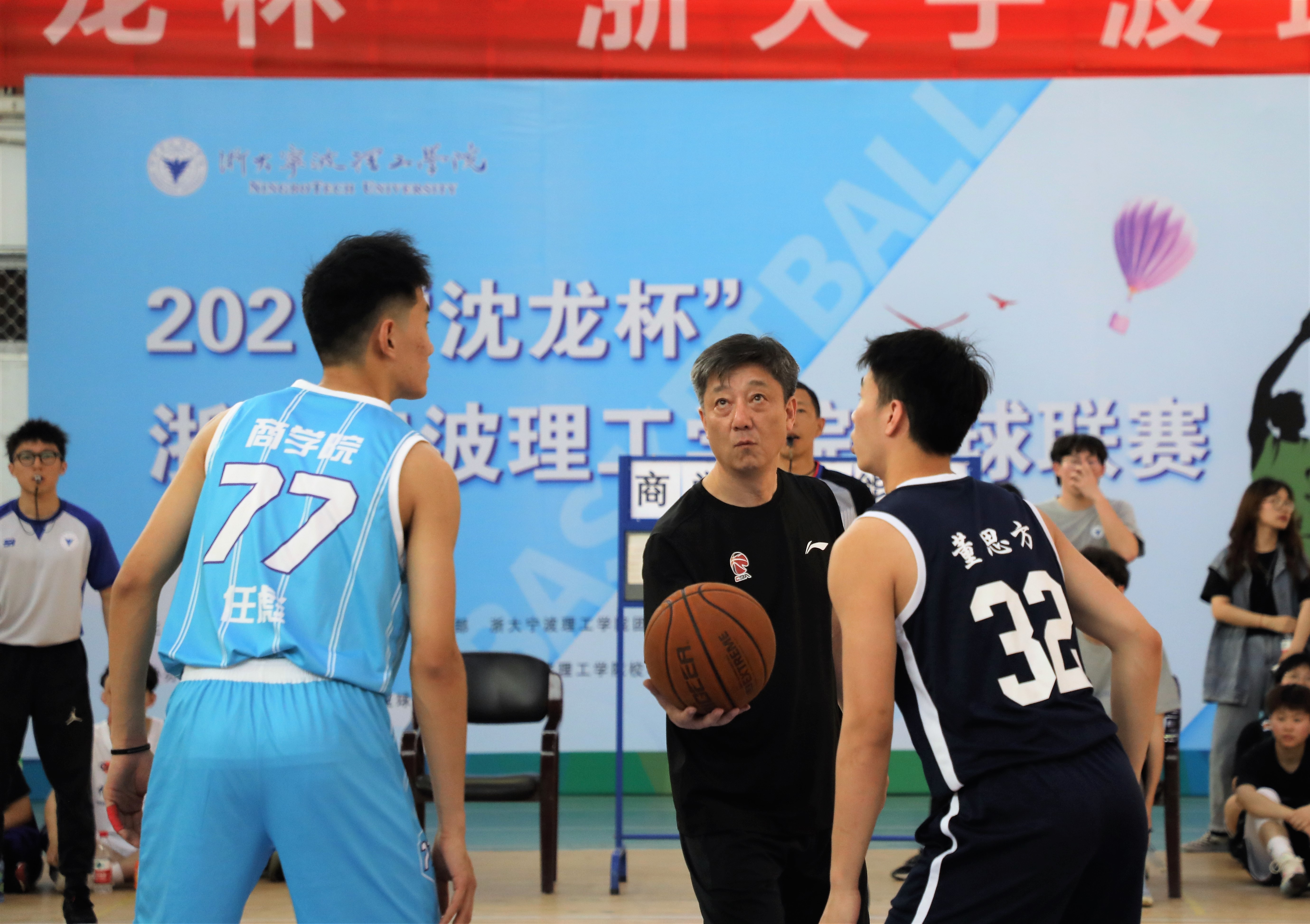 开幕式现场,胡征宇赠与沈龙浙江大学教授篮球队专用篮球,并为比赛开球。