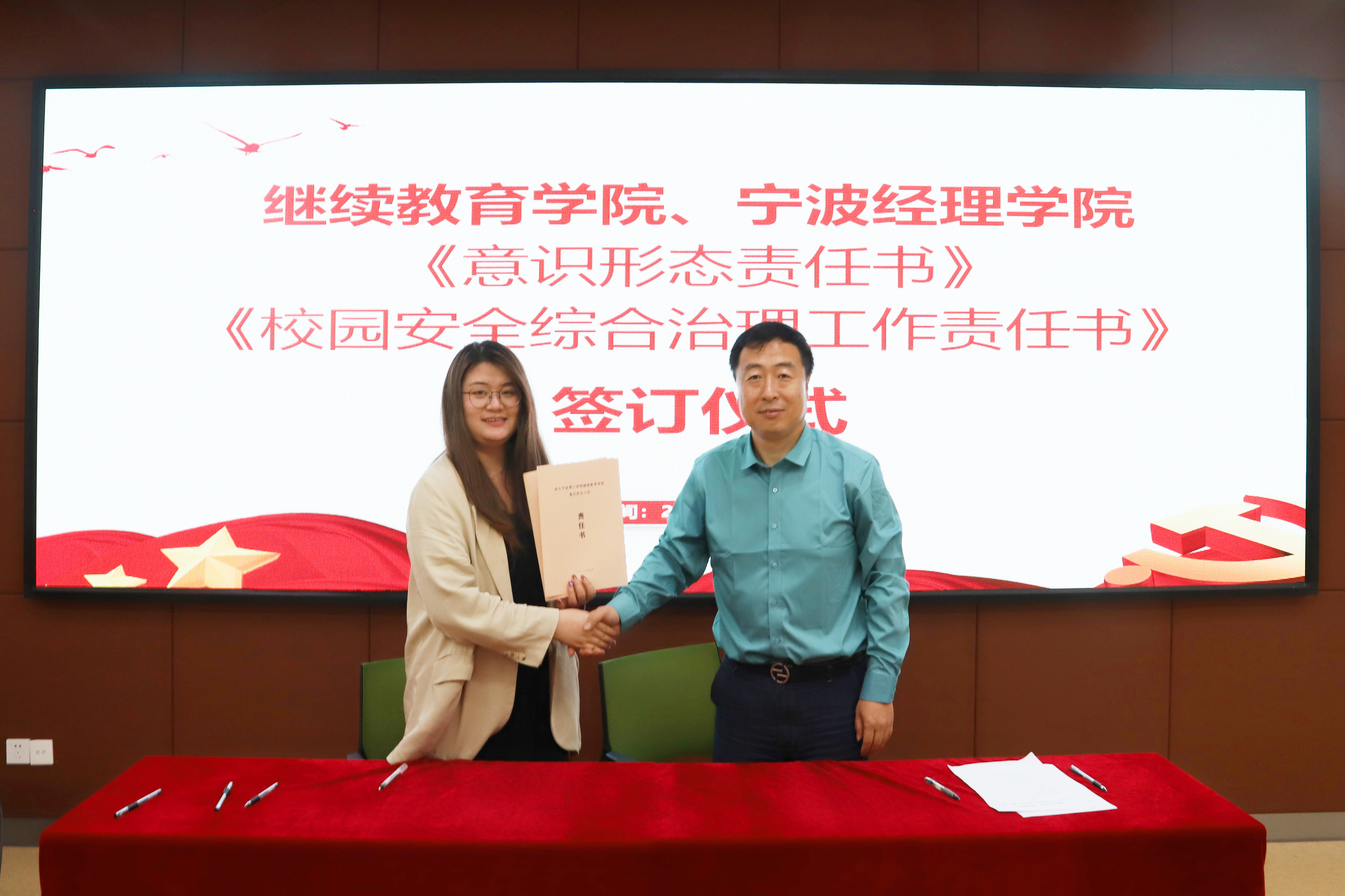 会上,金朝晖、贾小鹏与学院各部门负责人签订《意识形态责任书》和《校园安全综合治理工作责任书》。