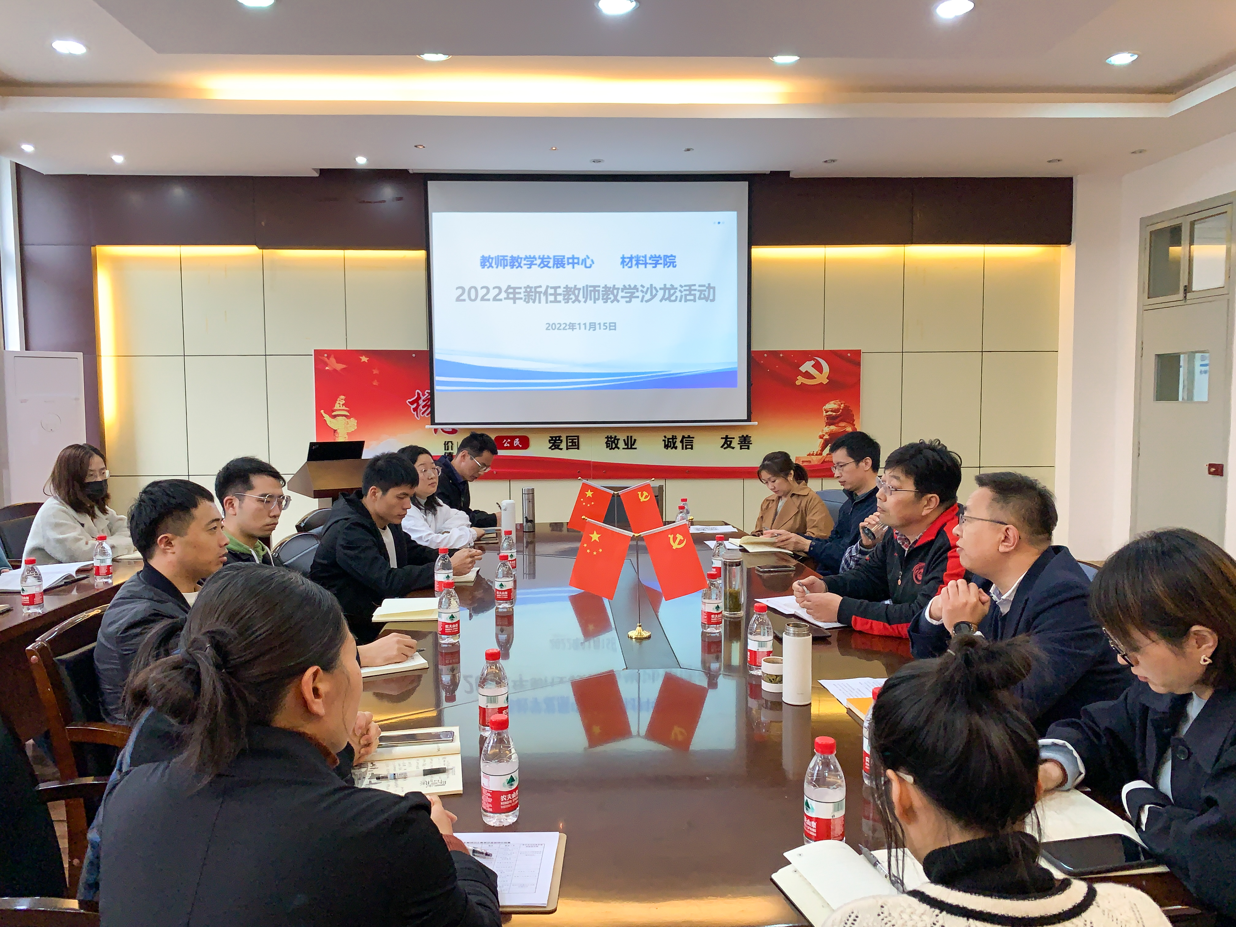 为更好地引领新教师、青年教师潜心育人、追求卓越,进一步发挥教学名师、教坛新秀等优秀教师的模范作用,根据教师教学发展中心“新任教师教学能力提升专题培训”计划,由材料学院承办的首场主题教学沙龙活动于2022年11月15日下午在NE209顺利召开。座谈会邀请钟国伦教授、高分子材料系副系主任邓萌副教授、高级实验师程捷老师与来自材料学院、生化学院和机能学院的2022年新任教师交流教学工作经验。教务处处长沈昊宇、材料学院党总支副书记俞峰、教师教学发展中心主管徐晓红参加了座谈会,座谈会由材料学院副院长闫红强主持。