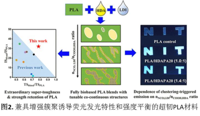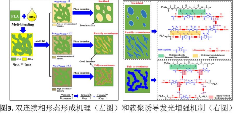 开云材料科学与工程学院生物质高分子材料团队负责人刘宏治教授继2019年在高分子领域国际顶级期刊Macromolecules(2019,52,8415)上率先报道了L-赖氨酸二异氰酸酯(LDI)诱导植物油基氢化二聚酸(HDA)动态硫化增韧PLA策略后,与郑州大学材料学院刘浩副教授合作,通过调控这两种生物基单体反应性基团的当量比(nNCO,LDI/nCOOH,HDA),成功制备出兼具增强簇聚诱导荧光发光性能(CTE)和平衡力学强度(较纯PLA仅降低20%)的超韧PLA共混物(如图3所示),解决了PLA材料强度-韧性难以兼顾的矛盾,最大缺口冲击强度高达109.8 kJ×m-2(纯PLA的30.5倍);将原子力显微镜纳米力学表征技术与传统的相形态表征手段、理论模型计算相结合,阐明了该共混体系在超低交联尼龙弹性体增韧剂(HDAPA)含量下双连续相形成机理和CTE增强机制(如图4所示),并显示出该二异氰酸酯原位诱导二官能度脂肪酸单体原位动态硫化增韧策略在诱导形成双连续相形态和高效提升PLA冲击韧性方面的普适性。