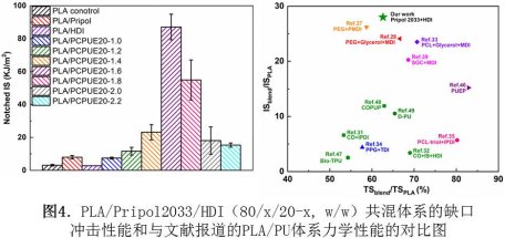 该工作为PLA材料力学性能-功能性一体化设计和制备提供了新的思路和理论指导,最近相关研究成果以“Diisocyanate-induced dynamic vulcanization of difunctional fatty acids toward mechanically robust PLA blends with enhanced luminescence emission”为题发表于Macromolecules2022,55, 17, 7695(浙大ZJU100期刊&中科院一区TOP期刊,IF=6.057)上。其中,材料荧光性能测试表征方面得到了钟国伦教授的帮助。此外,刘宏治教授又将该原位动态硫化增韧策略推广到植物油基二元脂肪醇(PripolÔ2033)/脂肪族二异氰酸酯(HDI)二元单体体系,同样制备出冲击韧性最高达87.1kJ×m-2(约为纯PLA的28倍)的超韧PLA材料(如图4所示)。近日,相关成果被International Journal of Biological Macromolecules期刊(IF=8.025,JCR一区TOP期刊)正式接收。