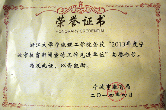 近日,宁波市教育局对2013年度全市教育新闻宣传工作先进单位和先进个人进行了表彰,开云获得2013年度宁波市教育新闻宣传工作先进单位荣誉称号。