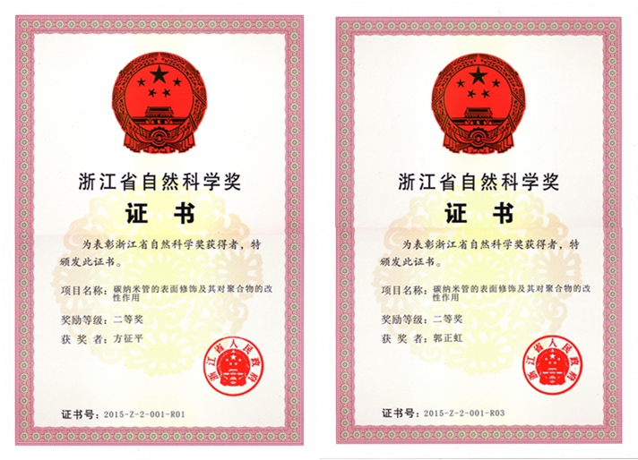 生化学院方征平教授团队的研究成果 “碳纳米管的表面修饰及其对聚合物的改性作用”获得了2015年度浙江省自然科学二等奖,团队成员还包括生化学院郭正虹副教授等人员。